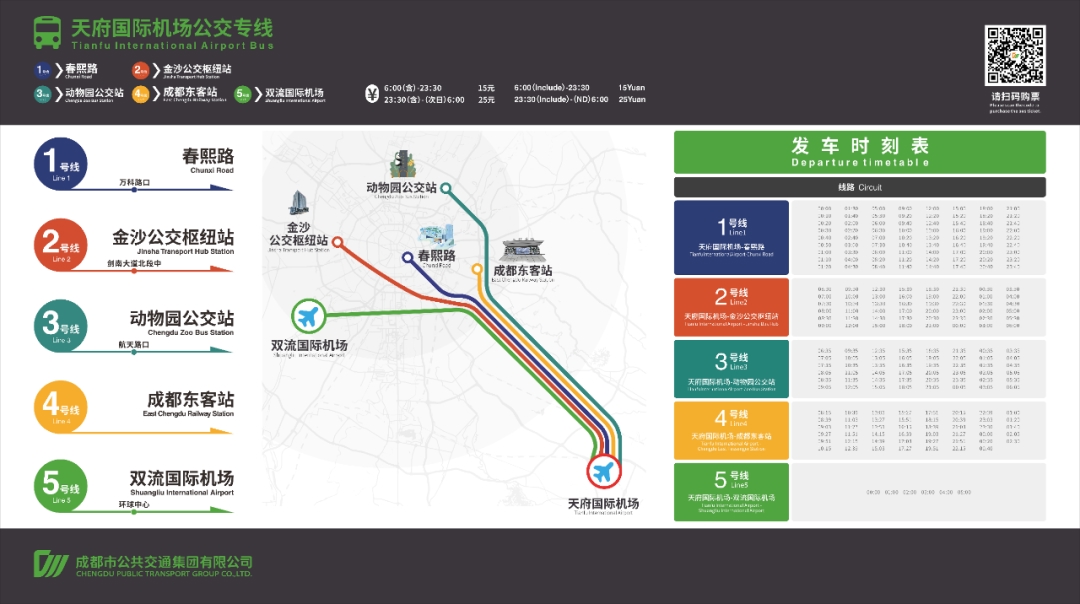 线路1:天府国际机场—春熙路(IFS国际金融中心熊猫下方),24H开行,单程预计行驶时间80分钟。