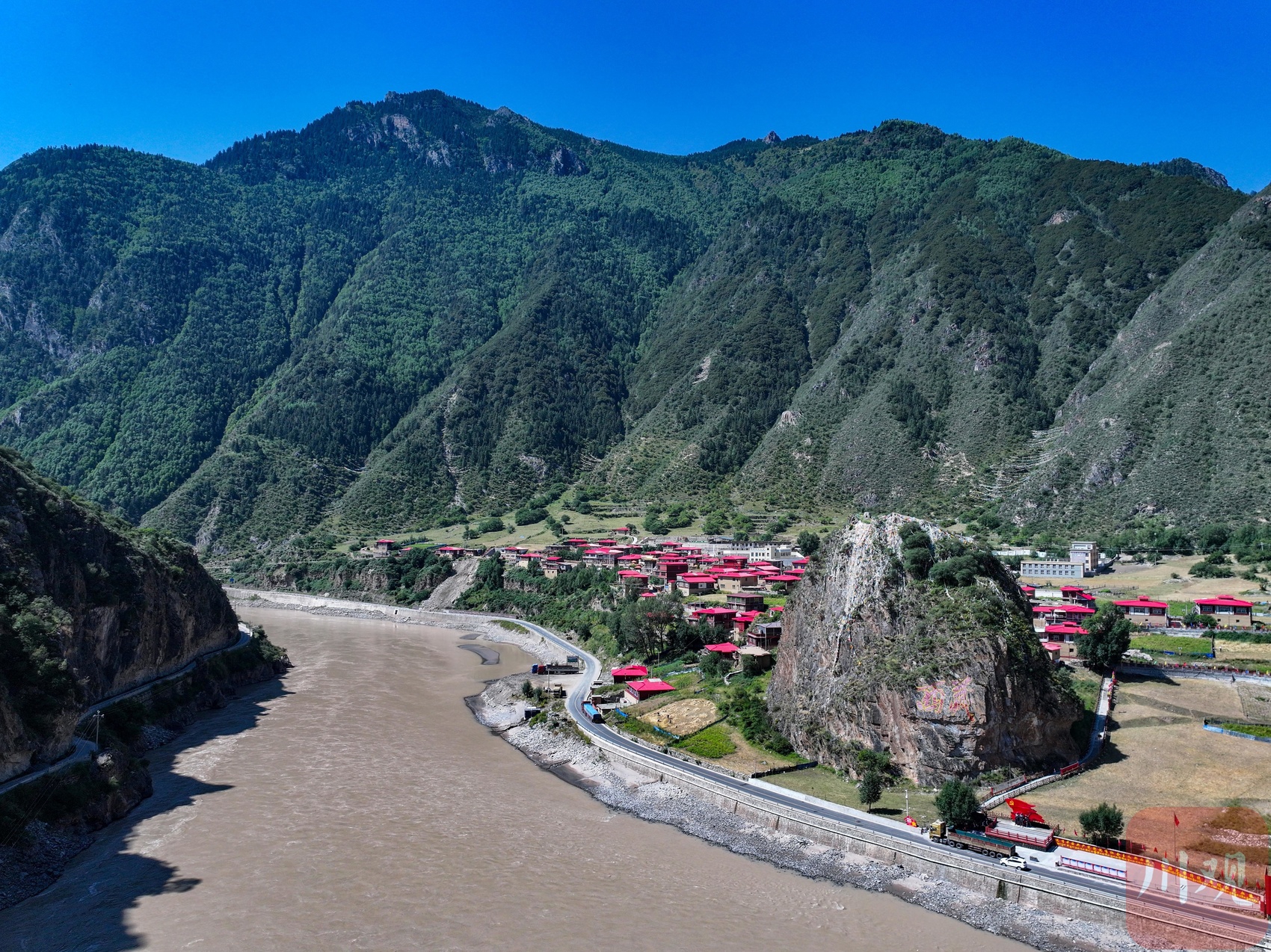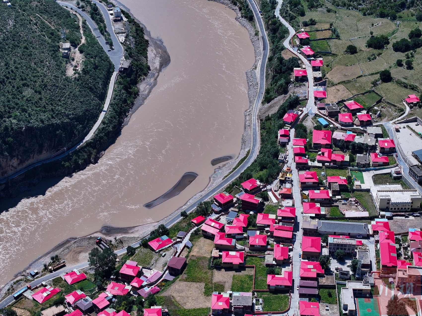 9月1日,甘孜州德格县,站在川藏交界的金沙江畔眺望,对岸红色屋顶的村庄便是西藏自治区昌都市江达县岗托镇的岗托村。
