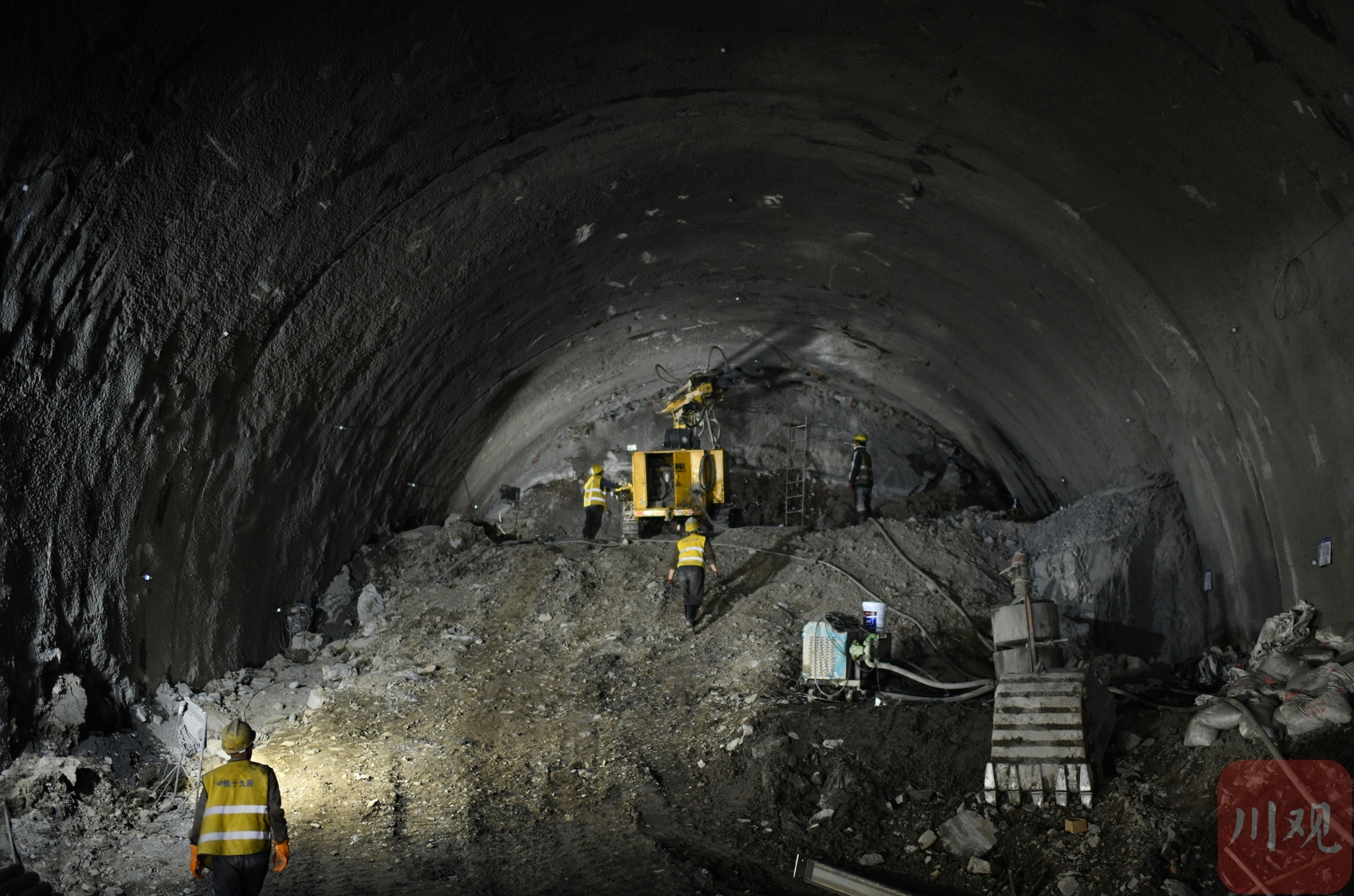 西宁至成都铁路红原二号隧道内工人紧张施工。