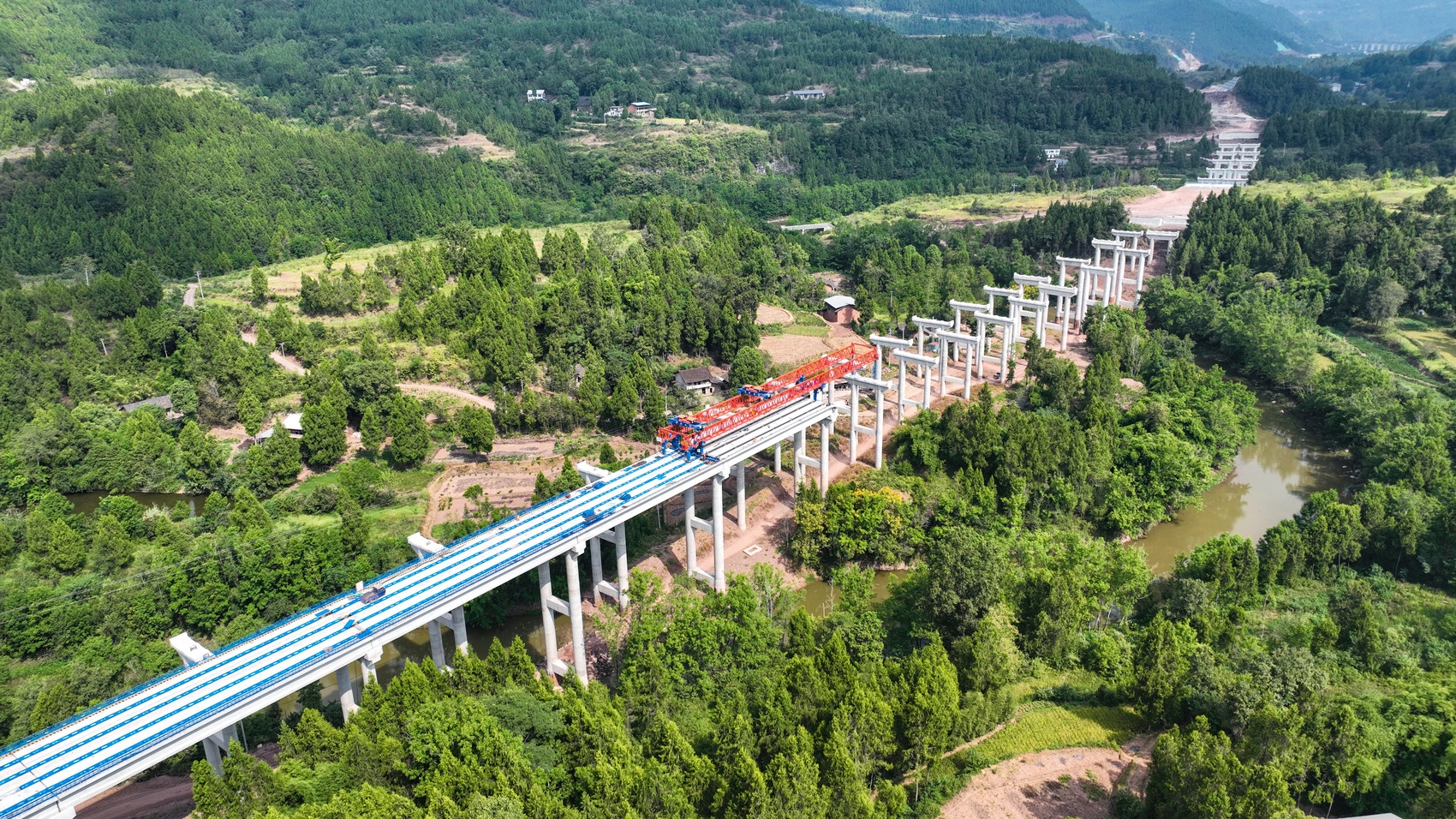 镇广高速通广段(平昌境)C6标段鞍子坪大桥T梁架设现场。