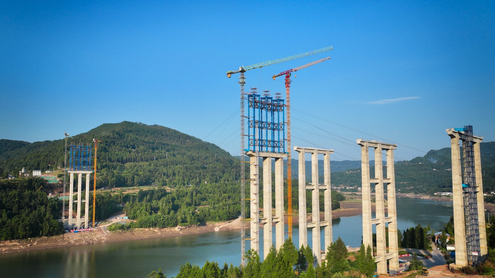 镇广高速通广段(平昌境)C4标段云台通江河特大桥建设现场。