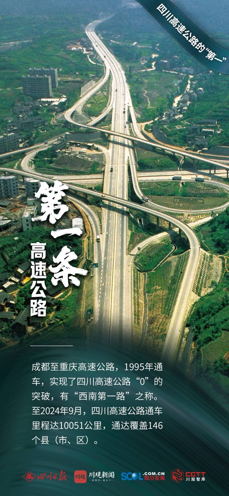 成都至重庆高速公路,1995年通车,实现了四川高速公路“0”的突破,有“西南第一路”之称。至2024年9月,四川高速公路通车里程达10051公里,通达覆盖146个县(市、区)。