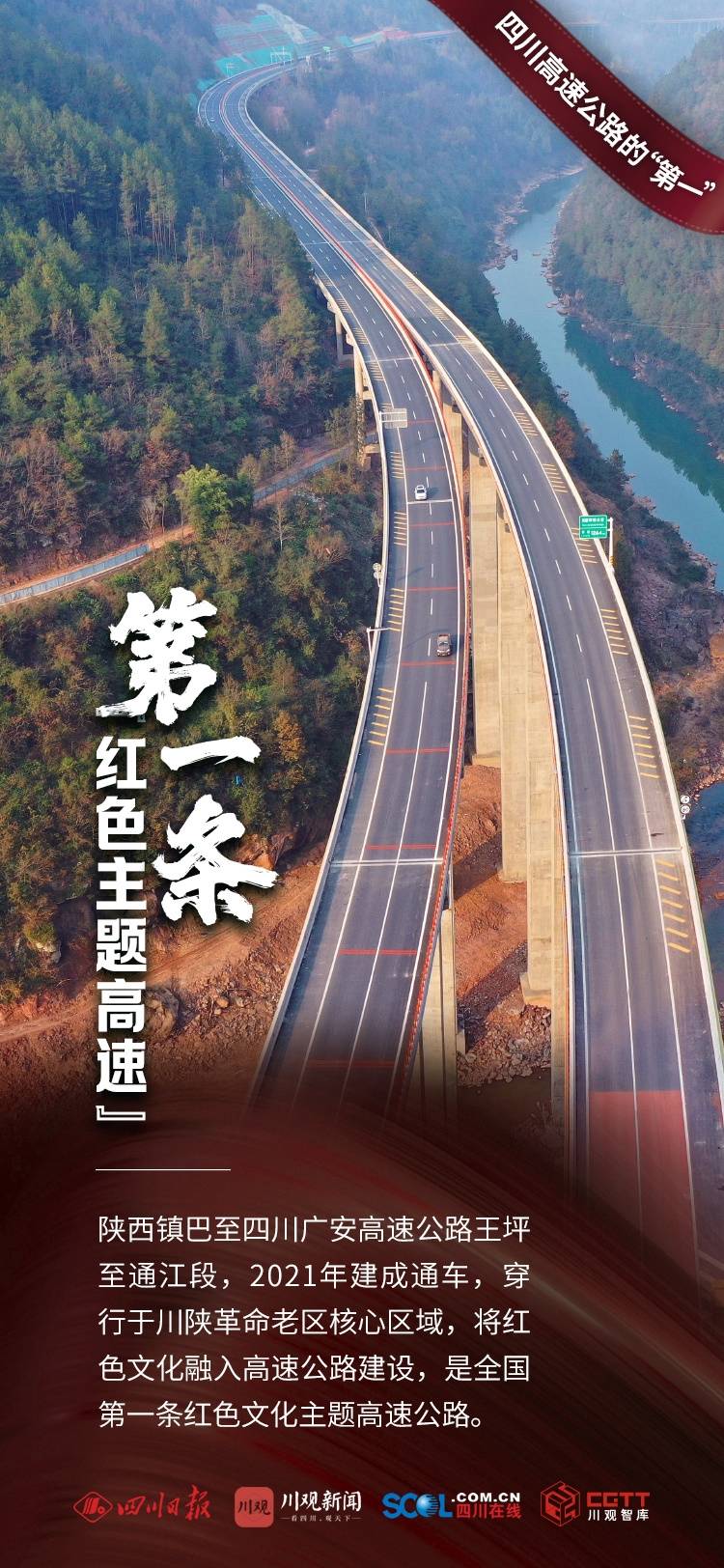 陕西镇巴至四川广安高速公路王坪至通江段,2021年建成通车,穿行于川陕革命老区核心区域,将红色文化融入高速公路建设,打造“交通+旅游”示范,是全国第一条红色文化主题高速公路。