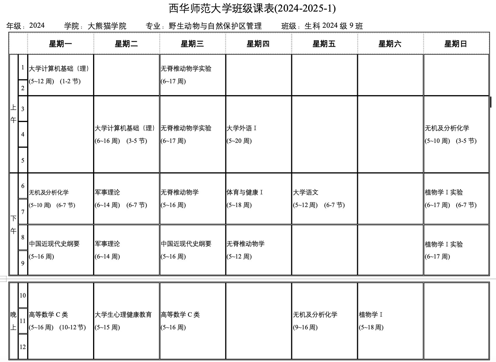 大熊猫学院野生动物与自然保护区管理专业新生课表。