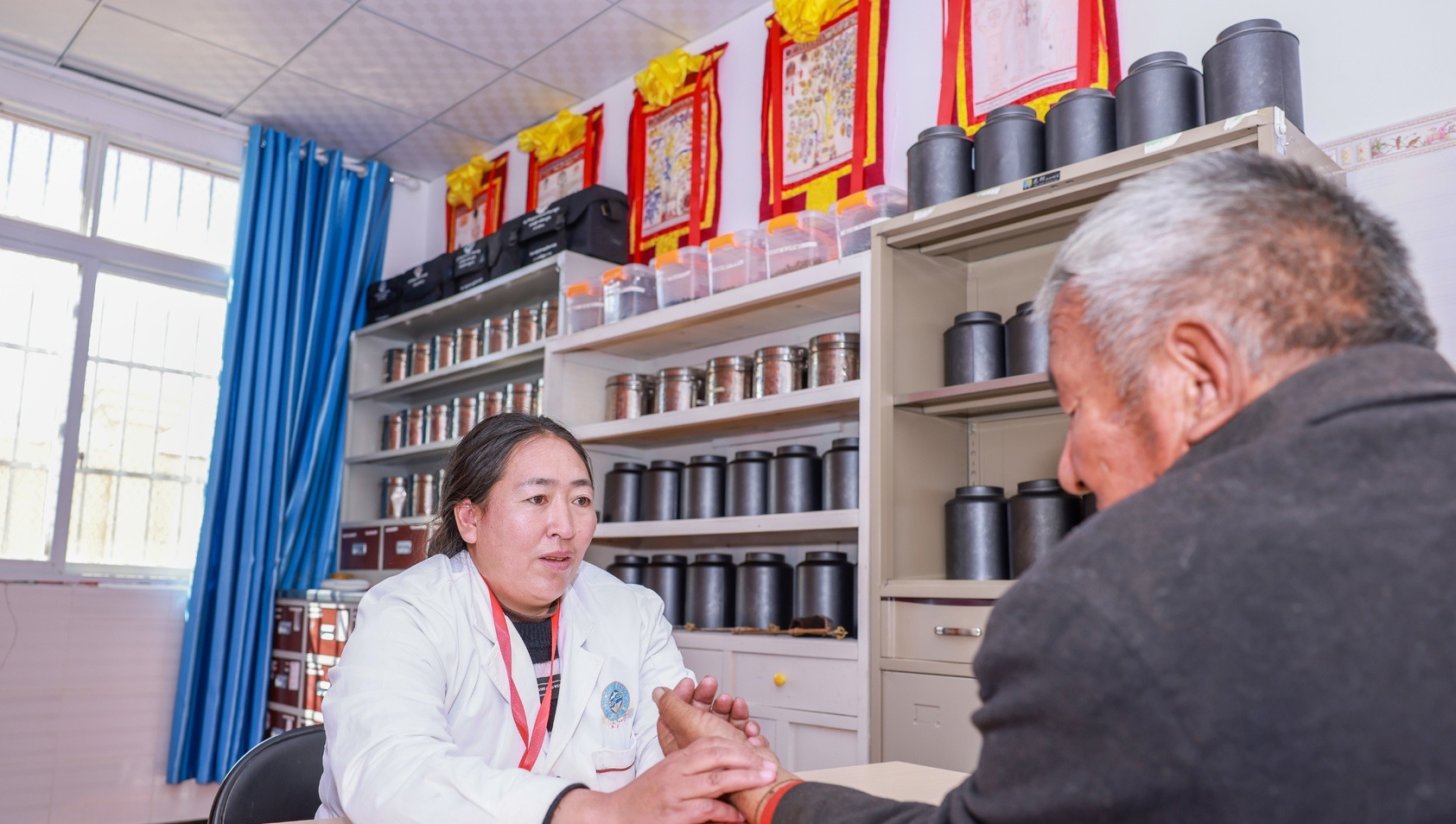 甘孜县卡攻乡的卫生院院长美朵拉姆正给患者把脉诊断。(甘孜县卫健局 供图)