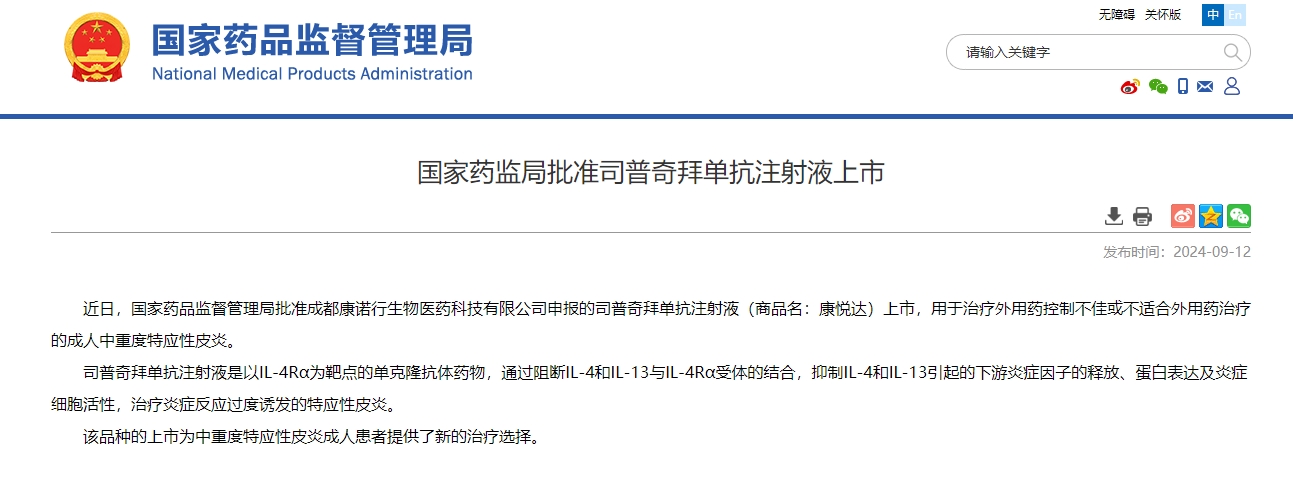 9月12日,国家药监局连发4则公告,又有4款创新药获批上市,其中包括成都康诺行生物医药科技有限公司(康诺亚生物医药科技有限公司全资子公司)申报的司普奇拜单抗注射液(商品名:康悦达)。记者从康诺亚了解到,这是国内首个、全球范围第二个申报并获批上市的IL-4Rα抗体药物,填补了国产特应性皮炎生物制剂领域的空白,将为中重度特应性皮炎患者提供新的治疗选择。