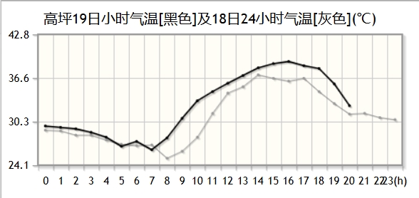 高坪国家气象观测站9月18日和19日实况气温观测曲线(截至9月19日20时)