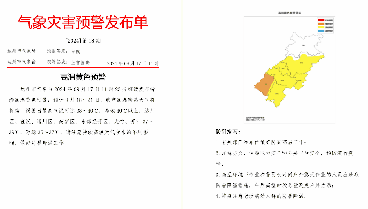 来自国家预警信息发布中心的信息显示,9月19日,四川各地共发布48个高温预警信号,涉及遂宁、达州、广安、绵阳、泸州、宜宾、德阳、南充、自贡、内江、乐山、眉山、雅安13市,其中达州渠县、德阳中江发布了高温红色预警信号。