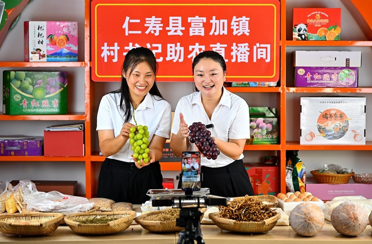 仁寿县富加镇大山村党支部书记杨奕(右)直播助销农产品(潘帅/摄)