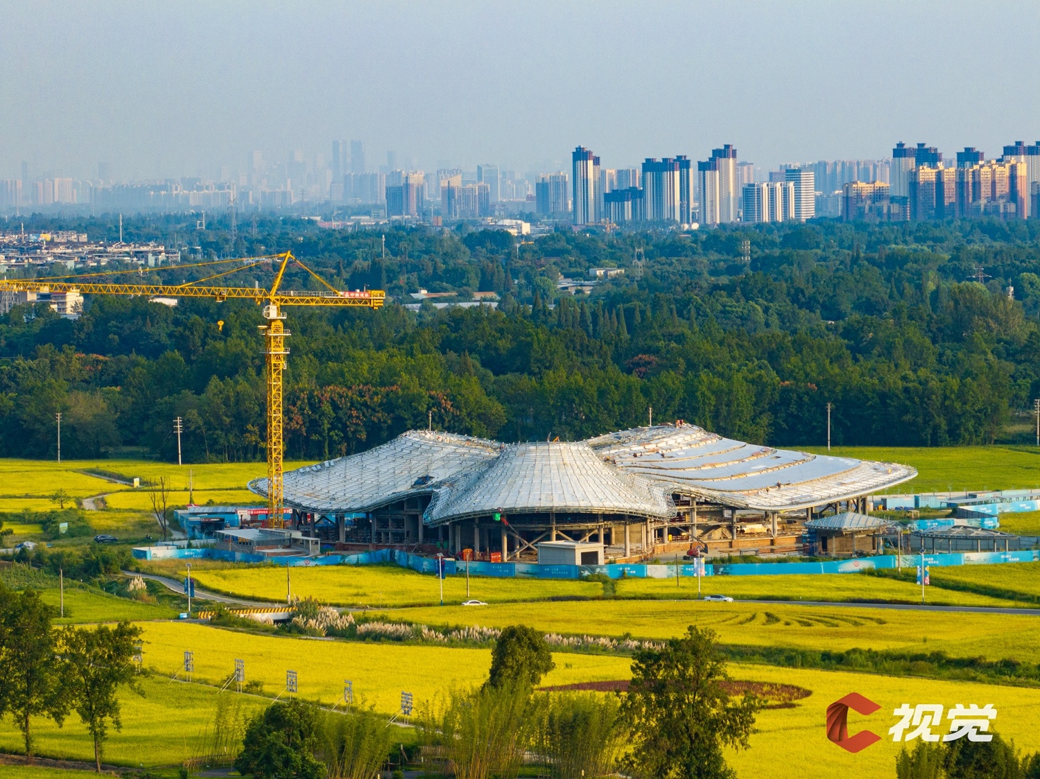 晚霞映照下的郫都区蝴蝶村星月堂·婚宴中心项目建设现场。