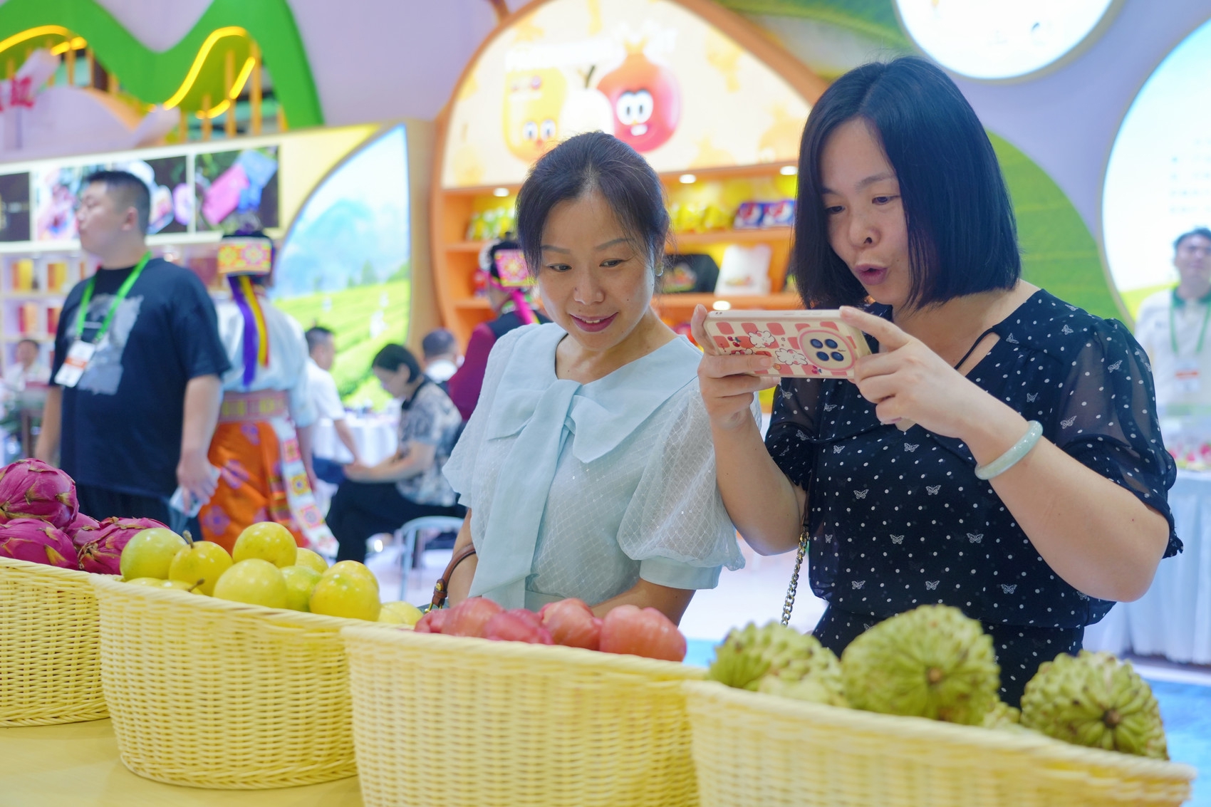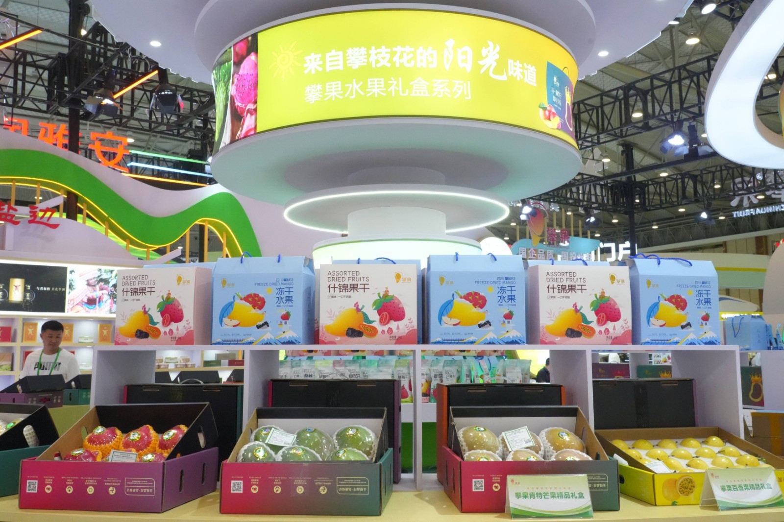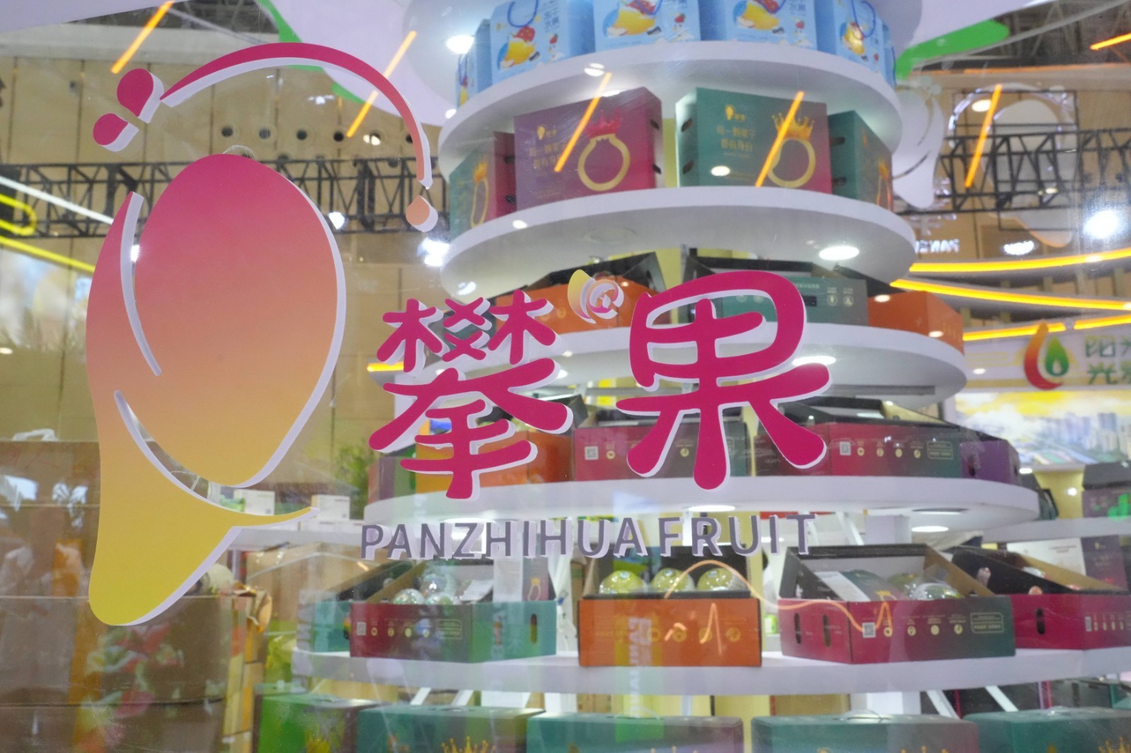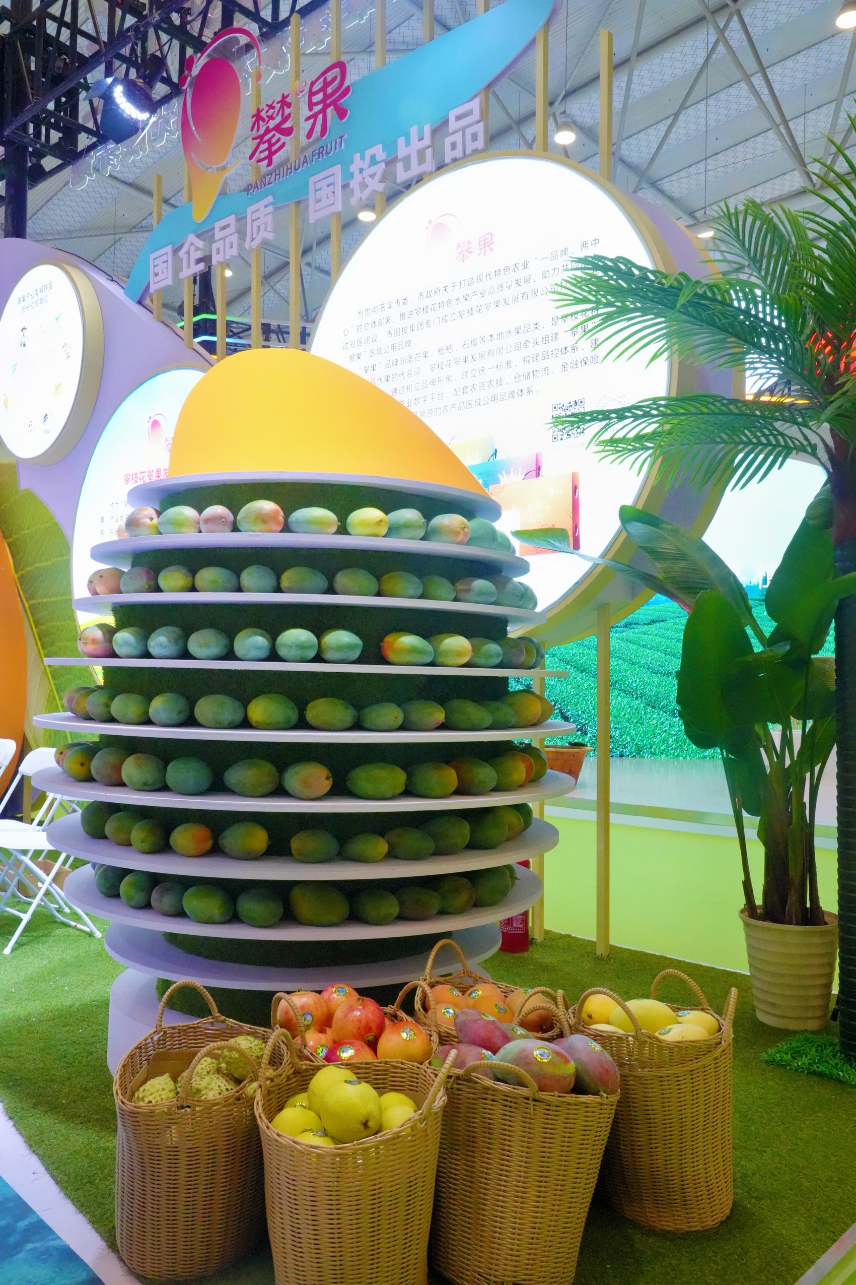 攀枝花展馆百余种农产品琳琅满目,场馆内果香、茶香、花香香气四溢,吸引了众多客商及消费者前来打卡,全场“人气王”当属攀枝花的特色水果。