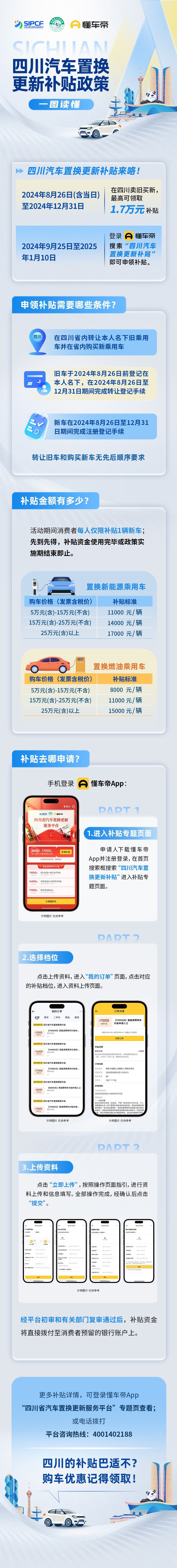 今年4月底,四川全面启动汽车报废更新工作,即消费者报废旧车购买新车可享受更新补贴(报废和更新无先后顺序)。今年8月,四川消费品以旧换新补贴政策全面升级,汽车方面做出两大调整:一是提高了报废更新补贴标准,其中报废旧车购买新能源车的补贴上调至2万元,购买燃油车的补贴上调至1.5万元;二是根据消费者实际需求,额外新增了置换更新政策,即对消费者在满足转让本人名下旧车,同时在四川省内购买新车且上牌登记为非营运性质等条件的情况下,对转让旧车后购买新能源车、或购买2.0升及以下排量燃油车的,分别给予1万元、7000元补贴,不再要求报废旧车。