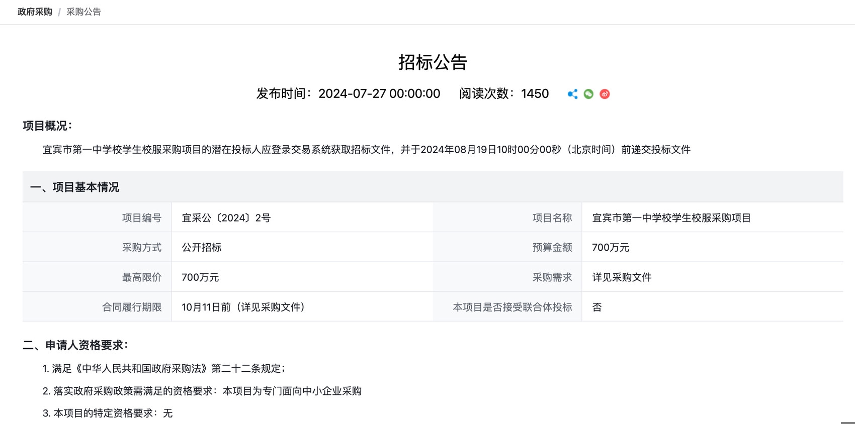 川观新闻记者在宜宾市公共资源交易信息网站上查询到,今年7月宜宾市第一中学委托宜宾市政府采购中心发布了校服采购项目招标文件,其中对校服质量和价格提出了明确要求,学校计划采购初高中T恤套装5600套,每套限价108元;初高中运动服套装5600套,每套限价149元;初高中冬季冲锋衣套装2800套,每套限价344元。据学校方面解释,这三种分别对应夏季、秋季和冬季校服。