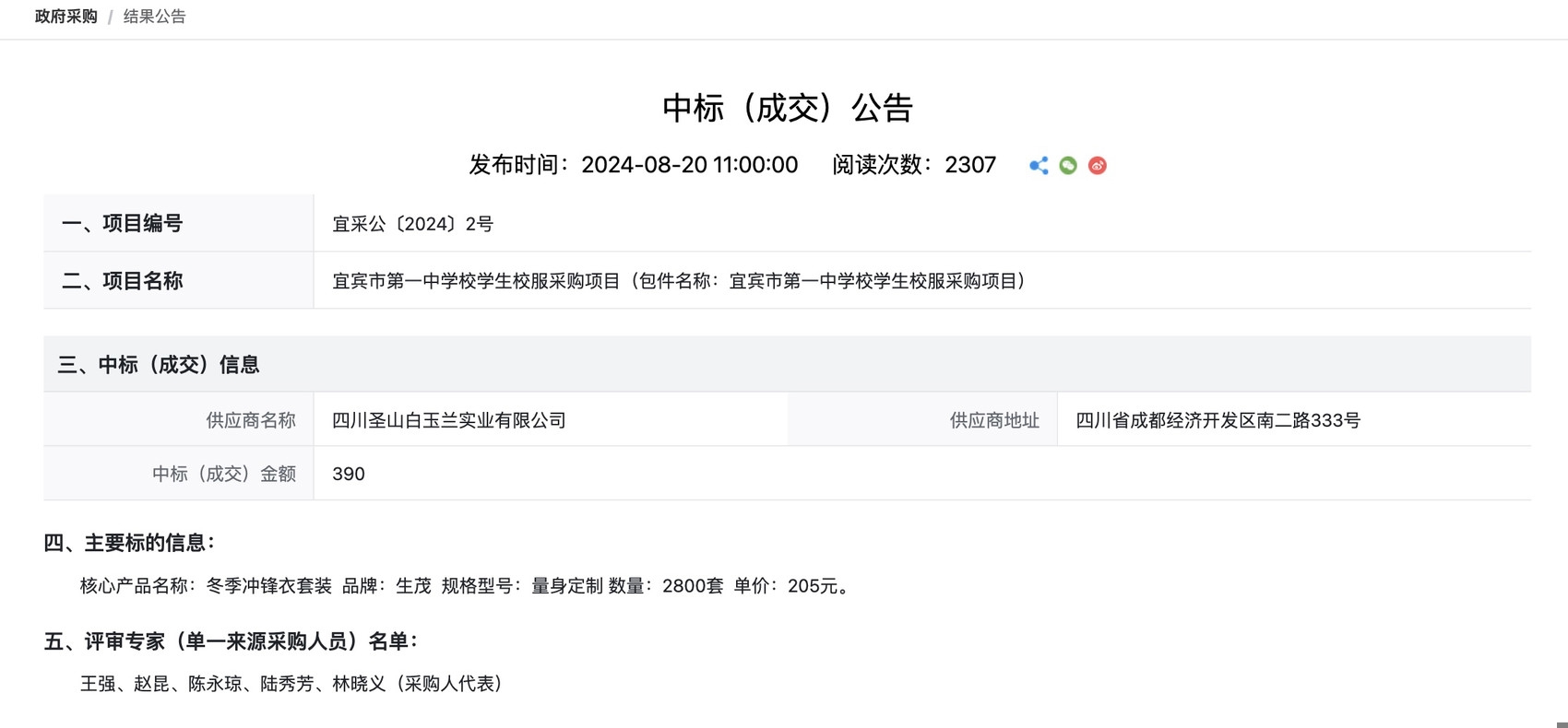 记者进一步查询了解到,宜宾市第一中学校学生校服采购项目在今年8月20日发布中标(成交)公告,四川圣山白玉兰实业有限公司中标,中标(成交)金额390万元,主要标的信息中显示核心产品内容为冬季冲锋衣套装。参与此次投标的共有11家公司,来自四川、重庆、浙江等多地。中标的四川圣山白玉兰实业有限公司,投标价格最低。