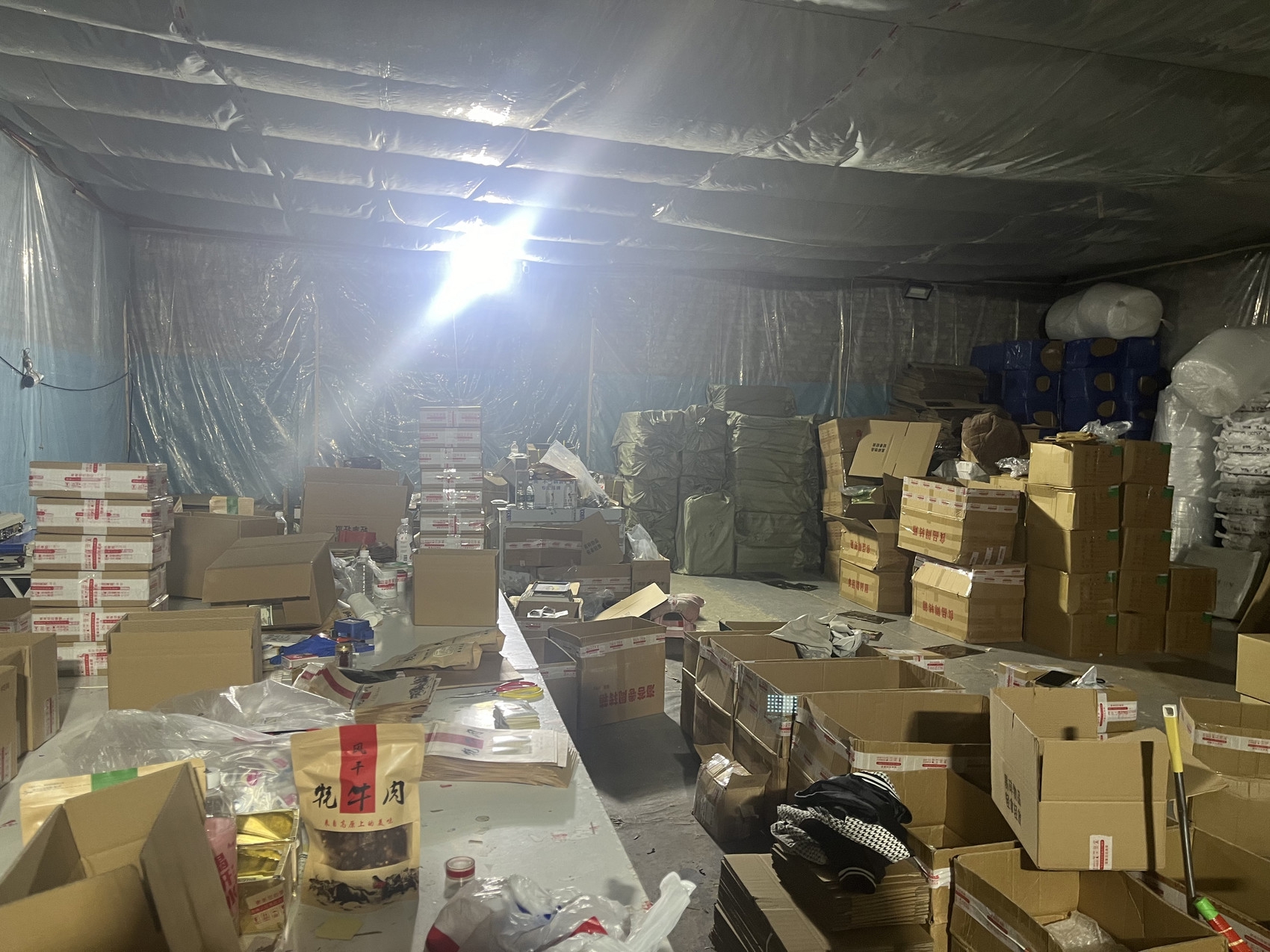 9月6日,富顺县公安局专案组赴西宁市抵近侦查,最终成功将5名犯罪嫌疑人抓获,现场查扣伪劣牛肉干2.27吨,各类包材130000余个,生产设备3套。