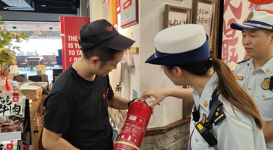 灭火器是否被杂物遮挡?电气线路是否有穿管保护?厨房是否装有燃气报警器……每到一处店铺,消防检查人员都会耐心地询问商家。