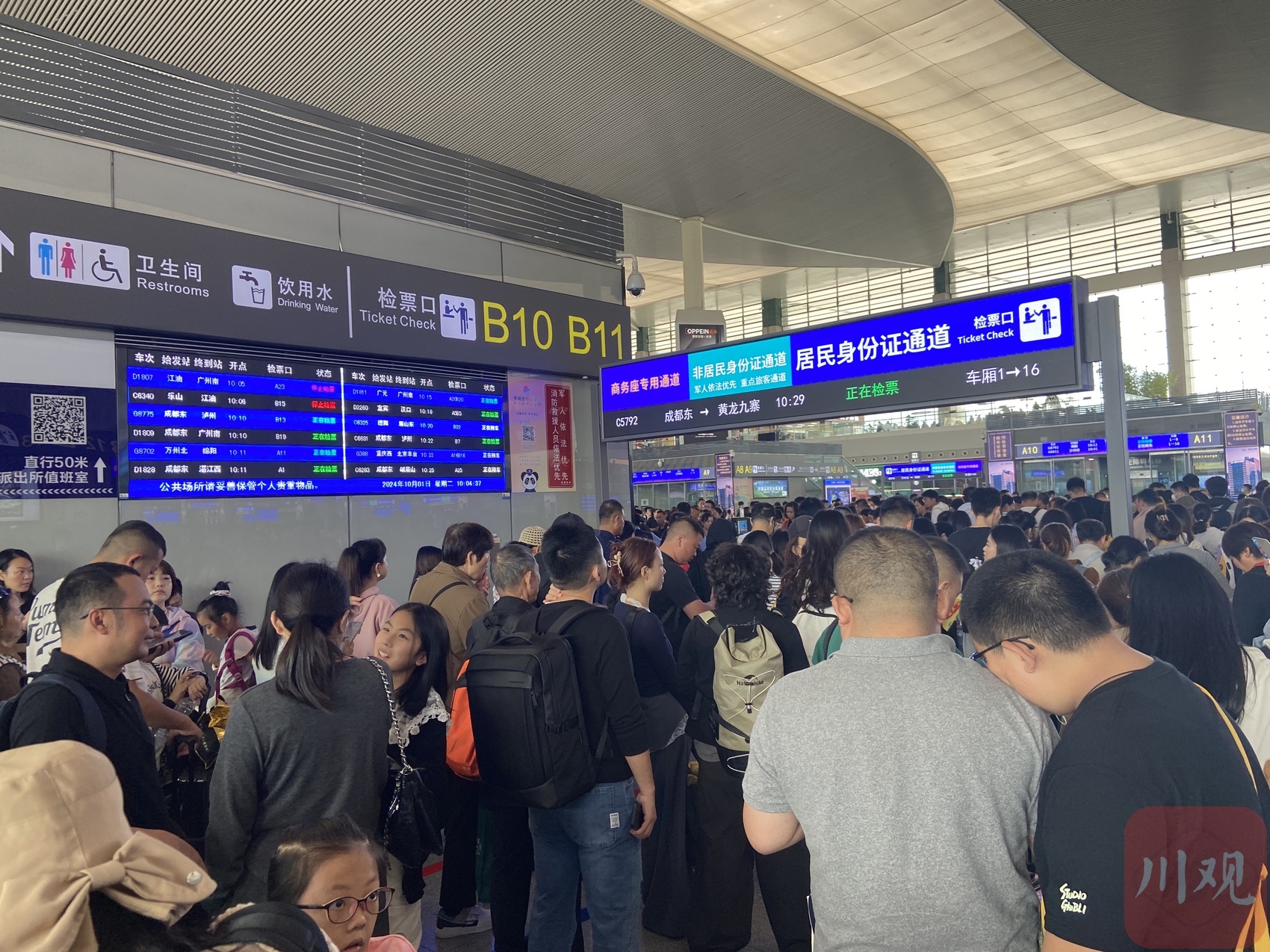 “人从众”!预想人会很多,10月1日早上,记者特意提前出发,赶到成都东站B10检票口时,看到等候乘坐该次列车的队伍十分“壮观”,五列队伍,蛇形移动,均长达几十米。随着“滴答”的刷卡声,源源不断的旅客拉着行李相继涌入。