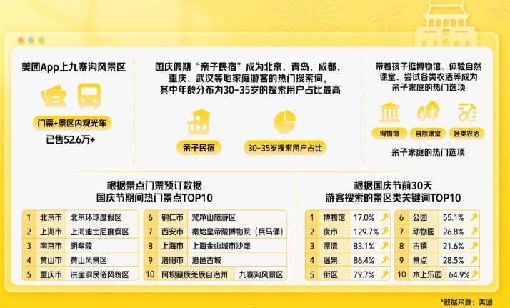 “首先是淡季变旺季,以前国庆节前的游客不多,今年明显增加了很多;其次是景区旅游旺季被进一步拉长,预计国庆期间满园的天数会有所增加。因为交通便捷,在团体游客和亲子游客外,还新增了很多四川本地的散客和年轻群体。”九寨沟景区相关工作人员介绍。截至10月1日,美团App上九寨沟景区的“门票+景区内观光车”销售量已接近55万。
