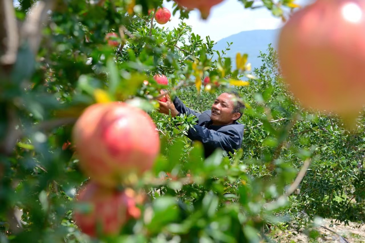 站在郑家坝村石榴园观景台眺望,群山环绕的万亩石榴园,五彩斑斓美如画,红似玛瑙的石榴果实沉甸甸地压弯了枝头,密密层层间,一颗颗成熟的石榴果解开了这里的振兴“密码”。