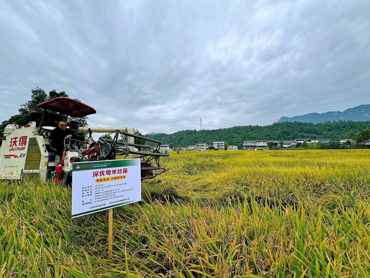 10月10日,旱播雨养节灌栽培水稻“深优粤禾丝苗”在江油市大康镇星火村进行实收测产。按农业部《全国粮食高产创建测产验收办法(试行)》,选择三块代表性田块进行现场机械实收,经测算,三块稻田平均亩产折合干谷1236.8斤。