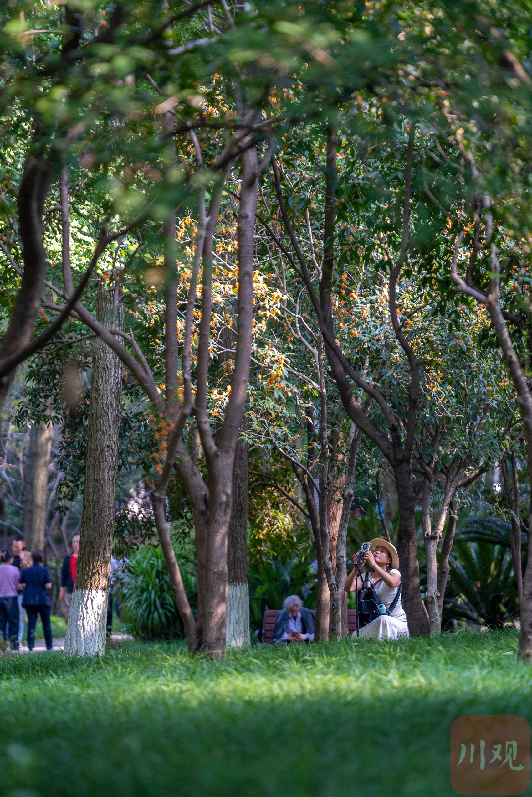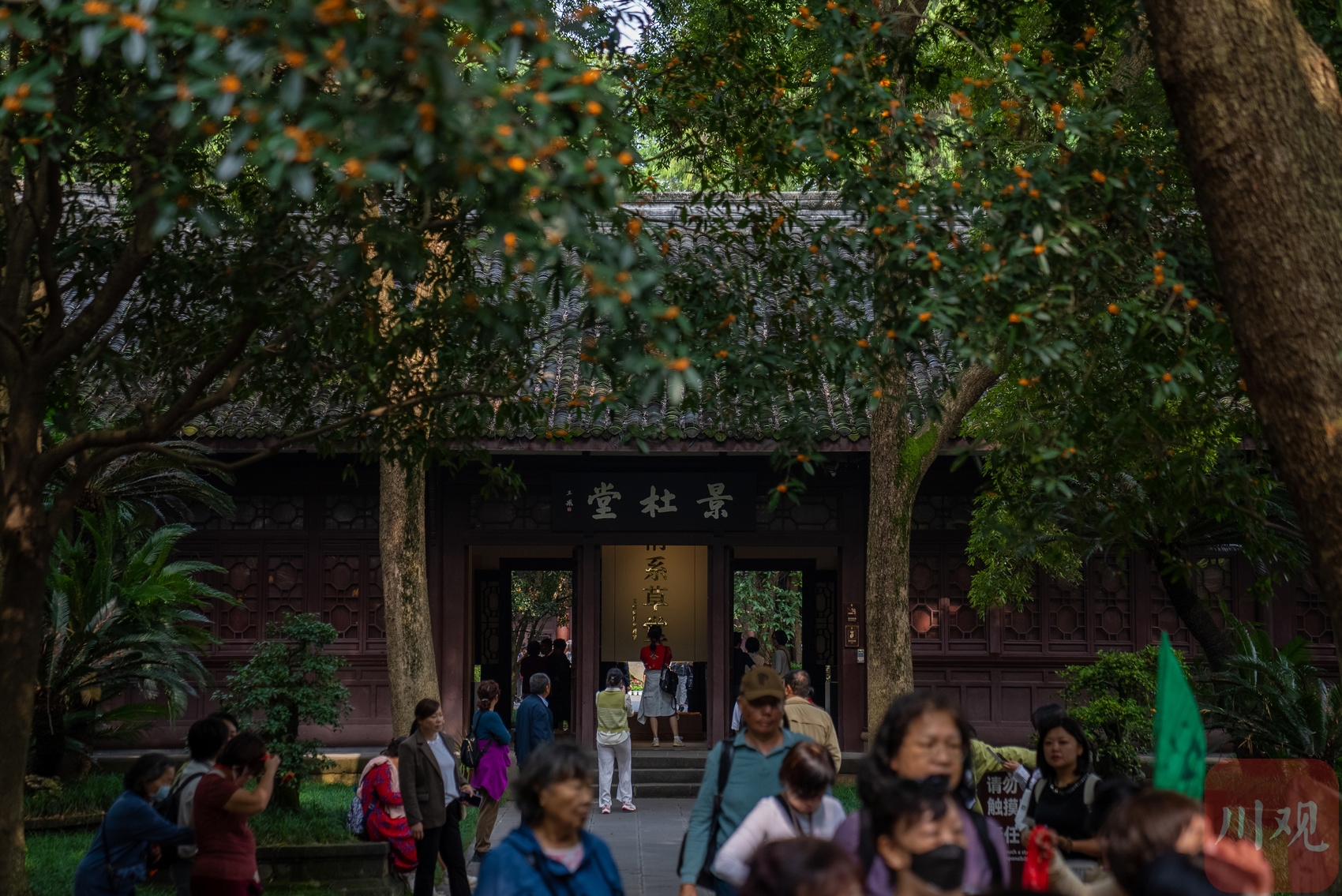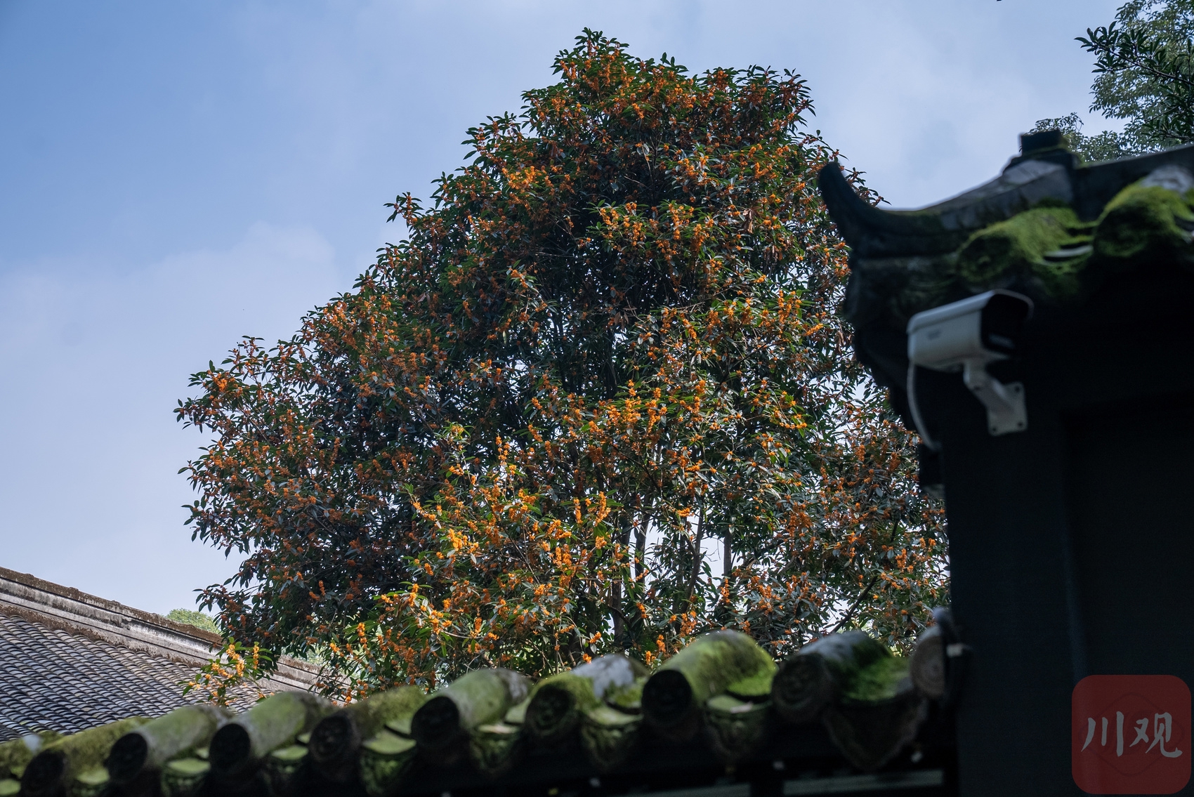 在杜甫草堂赏桂,似乎都能比别处多几分诗意。一阵风过,桂花香味在空气中四溢开来。