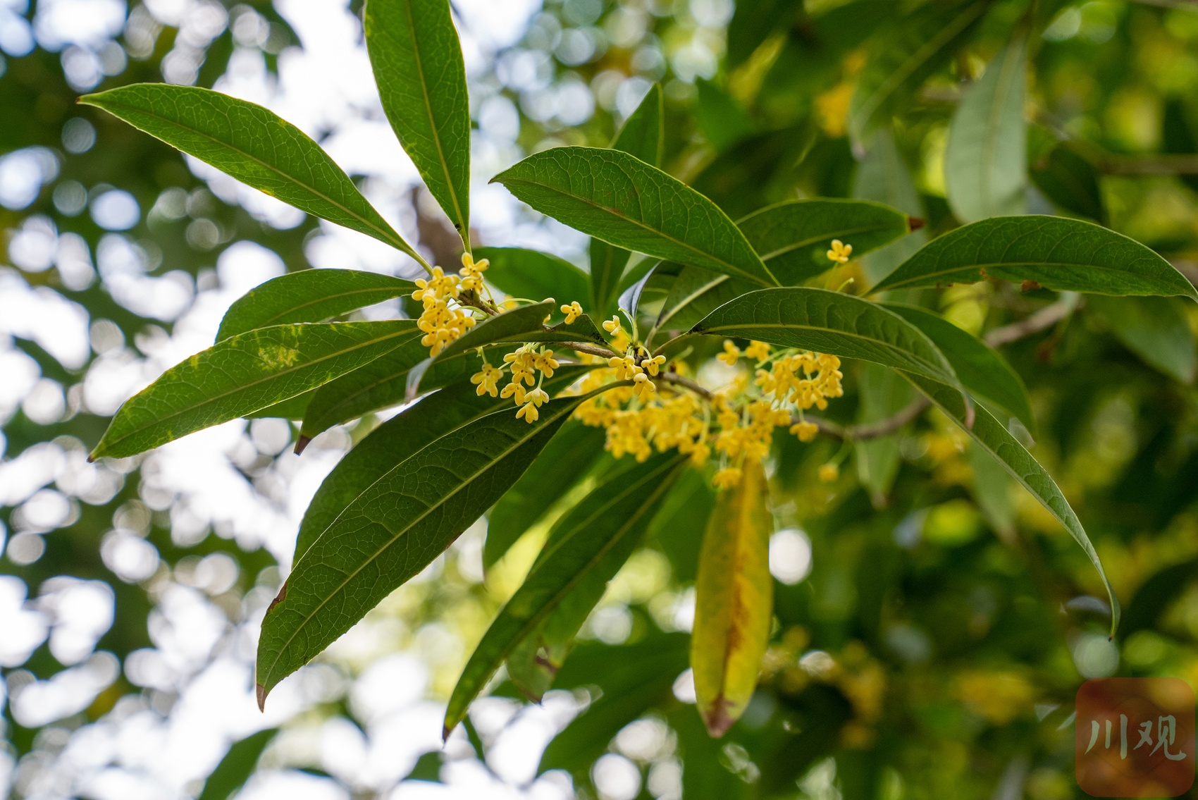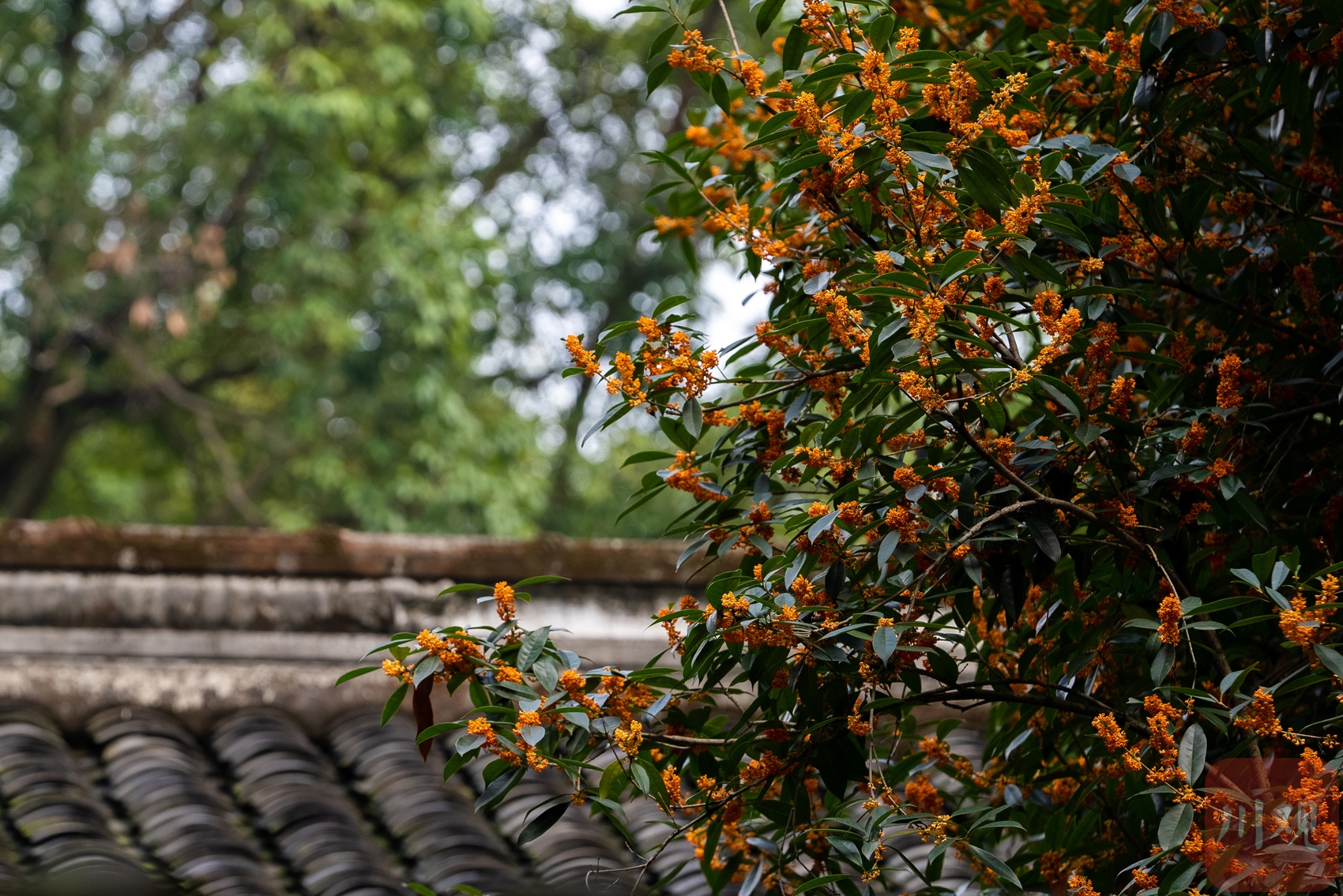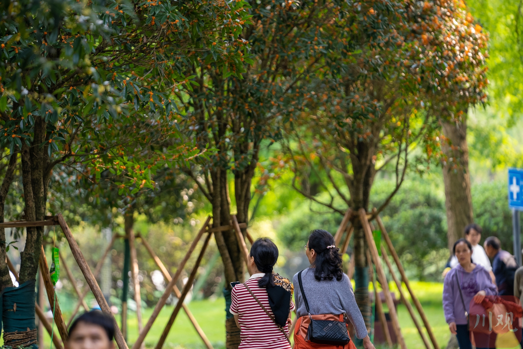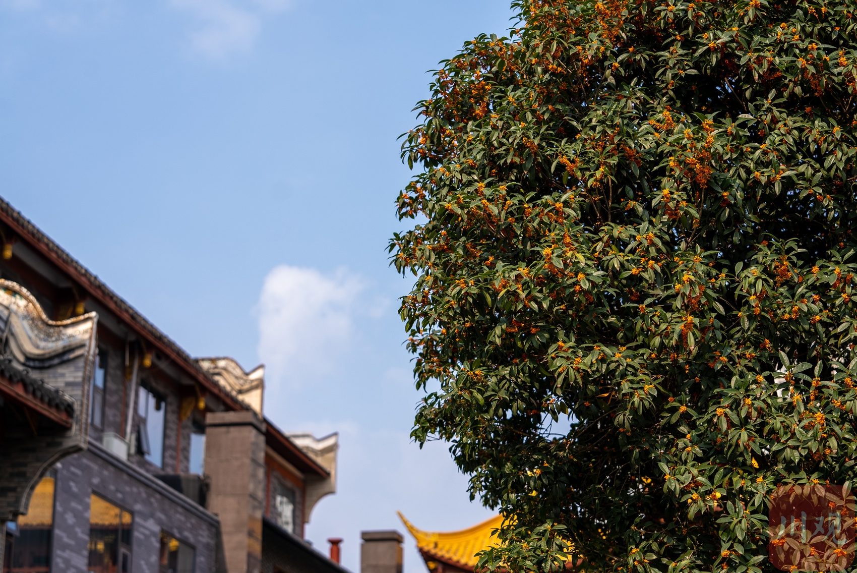 在杜甫草堂赏桂,似乎都能比别处多几分诗意。一阵风过,桂花香味在空气中四溢开来。