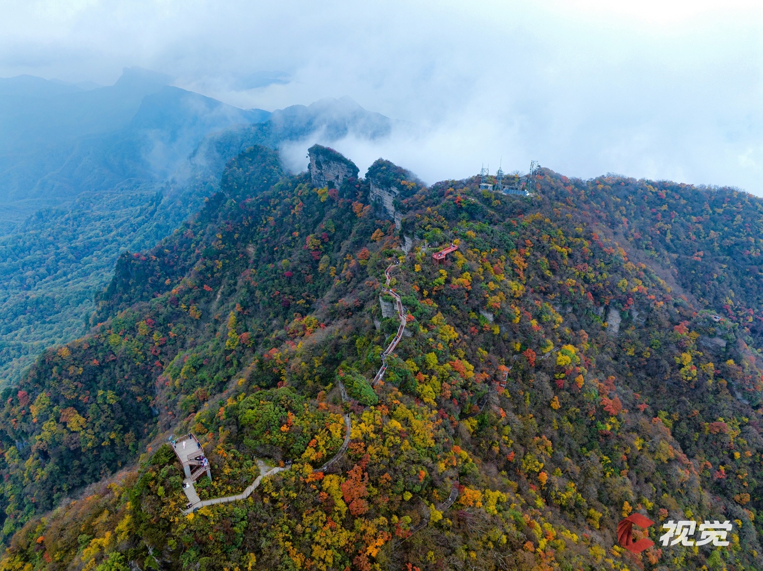 光雾山的米仓山旅游景区主峰香炉山层林渐染,云雾缭绕。