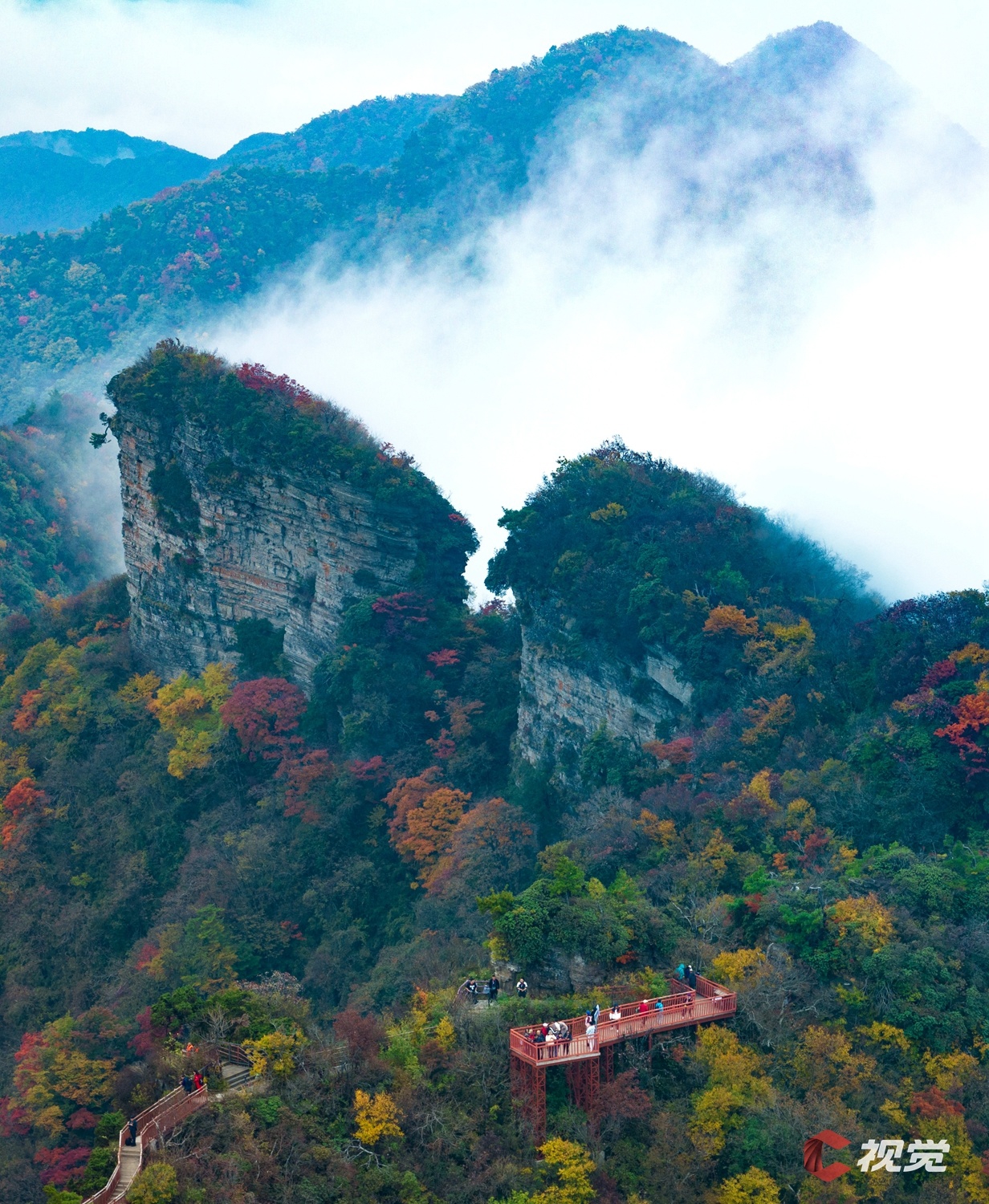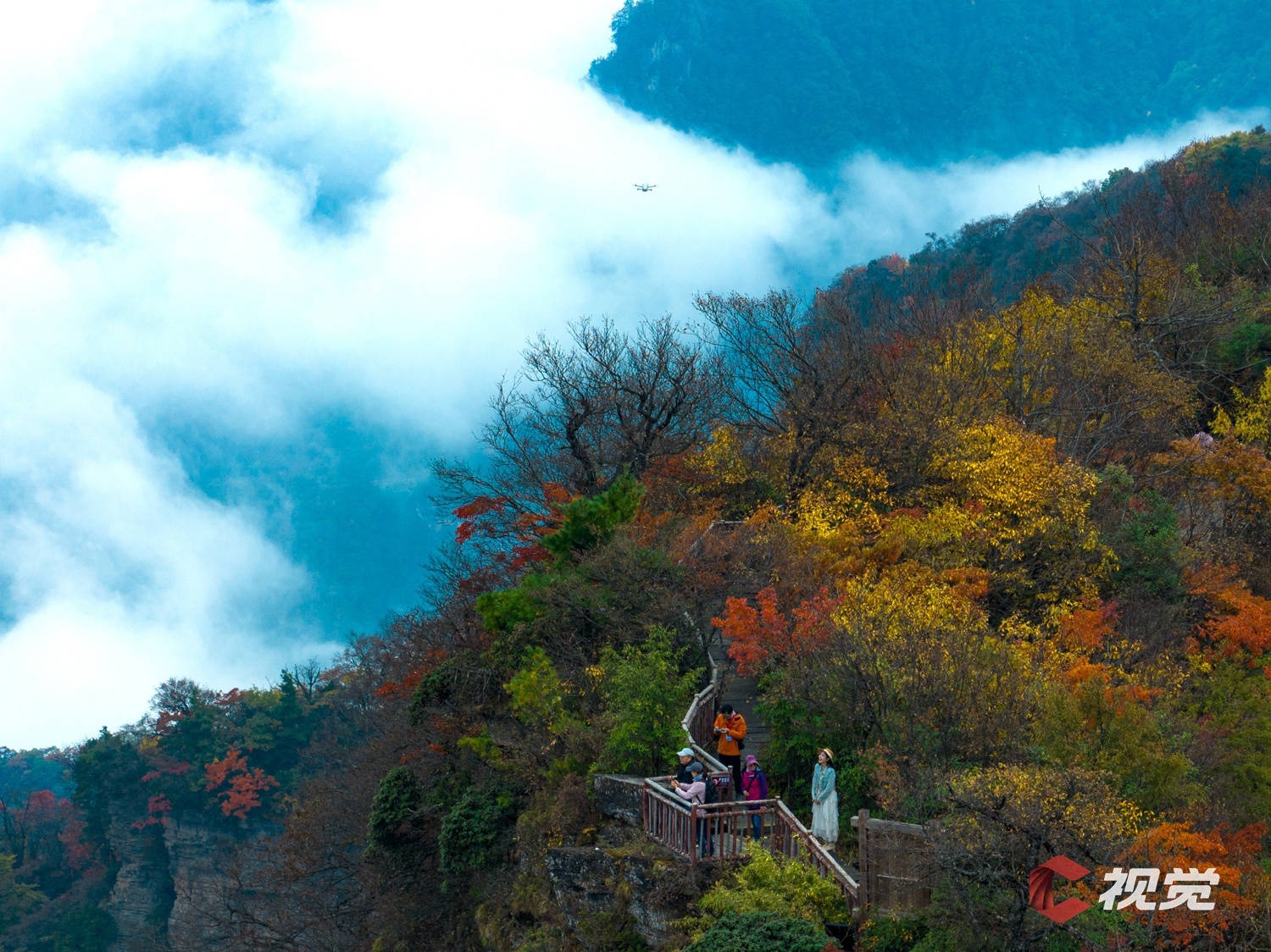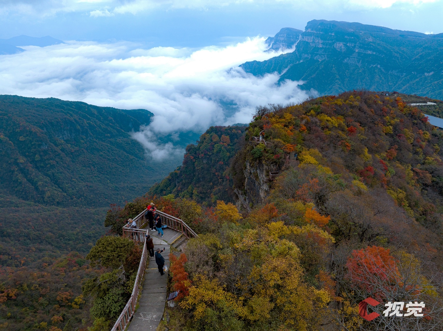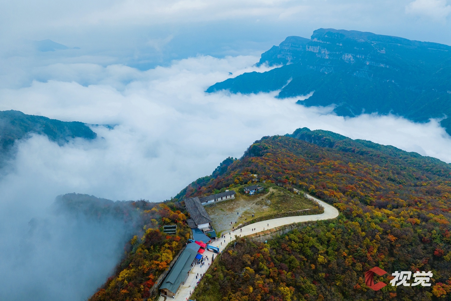 光雾山旅游区的层林换上五彩斑斓的“秋装”,与云海美景交相辉映。