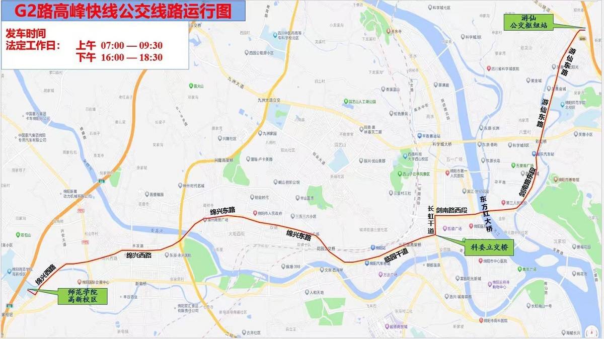绵阳市民注意了!10月26日起,绵阳将新开东西走向游仙片区至绵阳高新区片区的本市第2条城市高峰快线—G2,另优化调整5条公交线路。