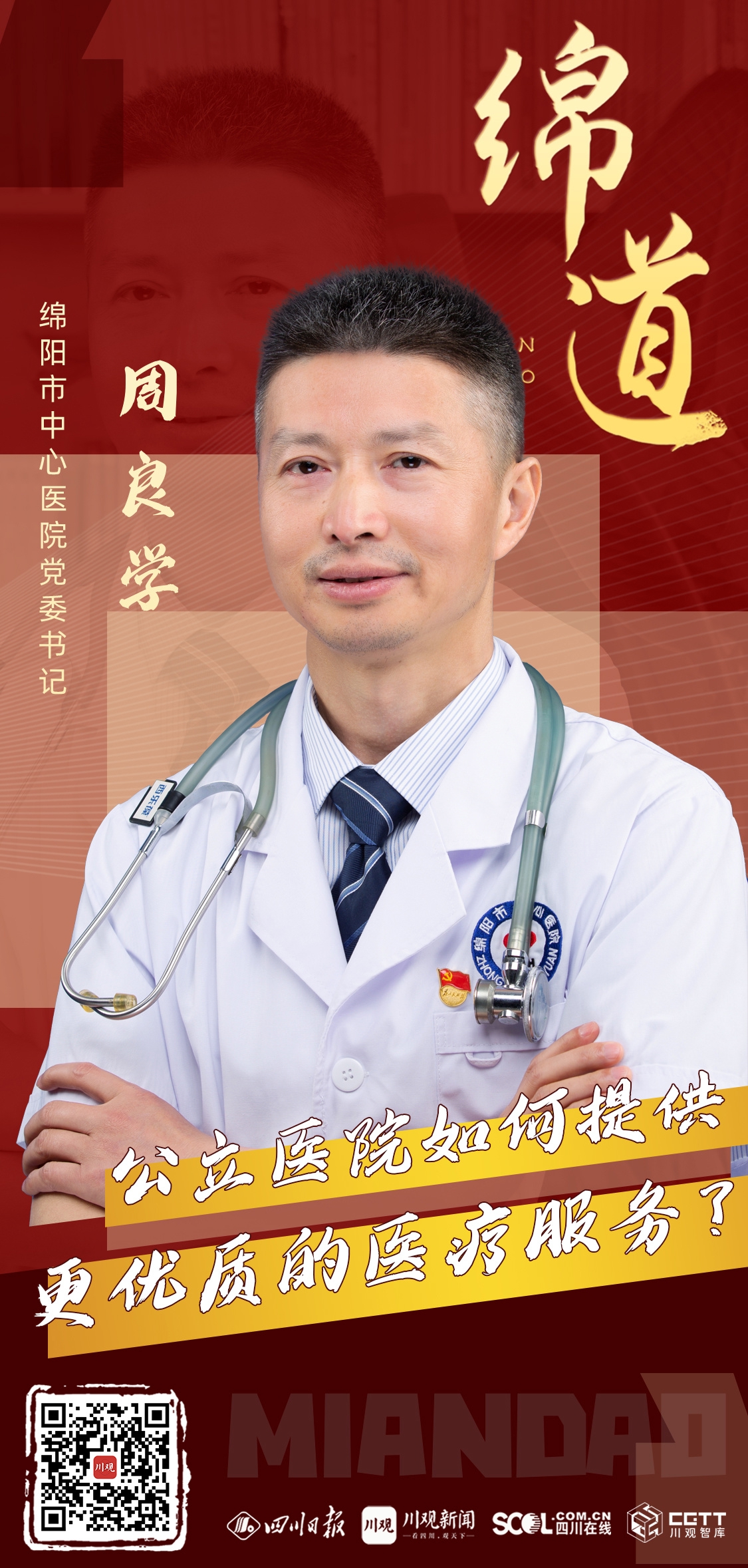 当前,绵阳正深度参与成渝地区双城经济圈建设,加快建设成渝医疗副中心。在此背景下,绵阳公立医院如何提升医疗水平,更好地满足人民群众对优质医疗服务的需求?本期绵道,记者与绵阳市中心医院党委书记周良学进行了交流。