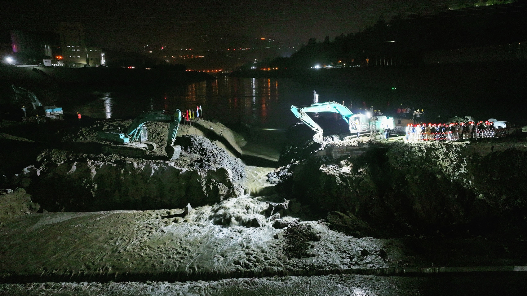 当天23点左右,二期上游围堰进行破口开挖,奔腾的金沙江水随即涌向主河床厂房与溢流坝上游,充水平压后江水经溢流坝段流向下游,银江水电站成功实现分流。
