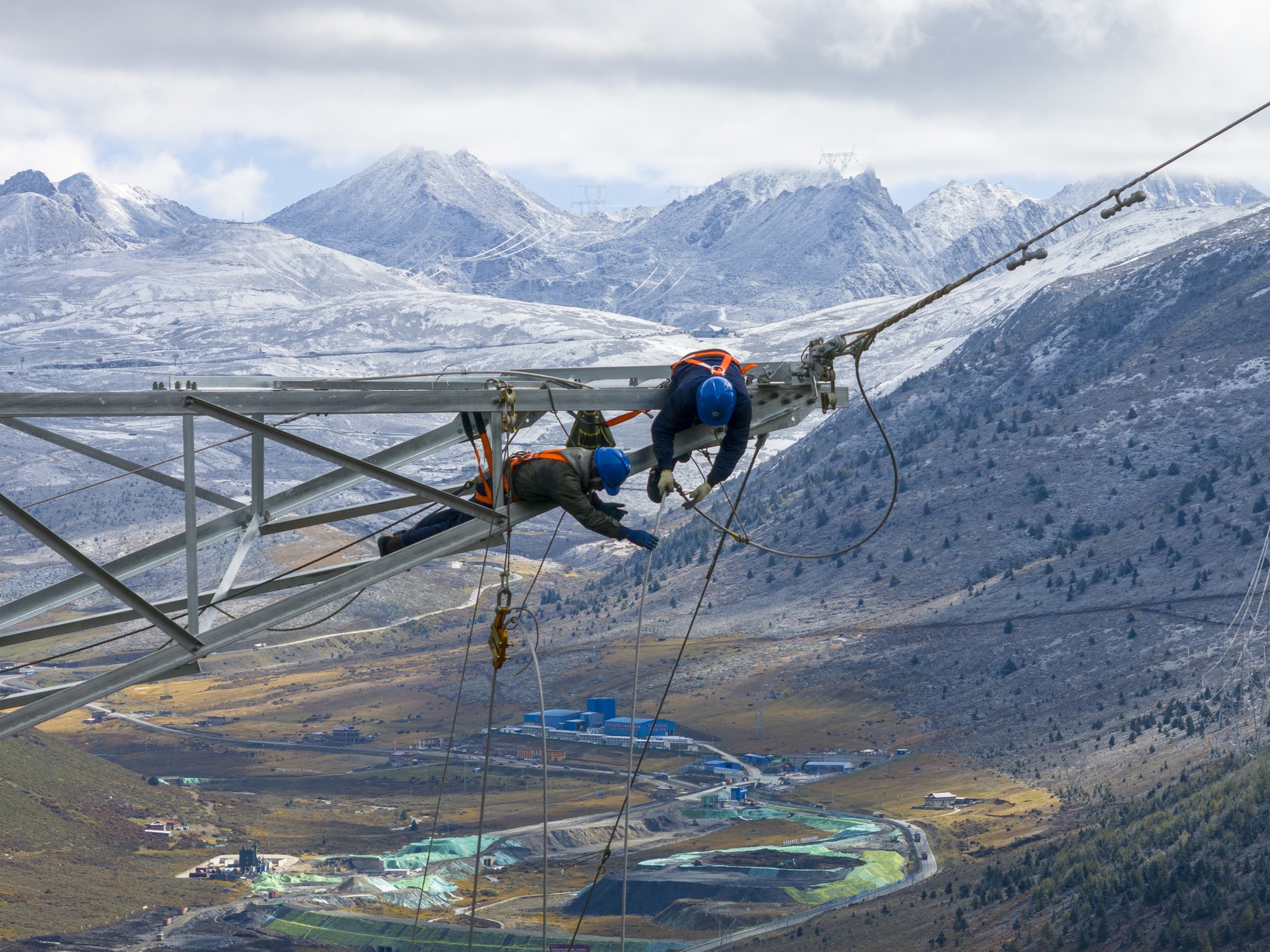 10月17日,甘孜州康定市,川渝特高压工程施工现场,工作人员在高空开展间隔棒安装作业。 田海 摄