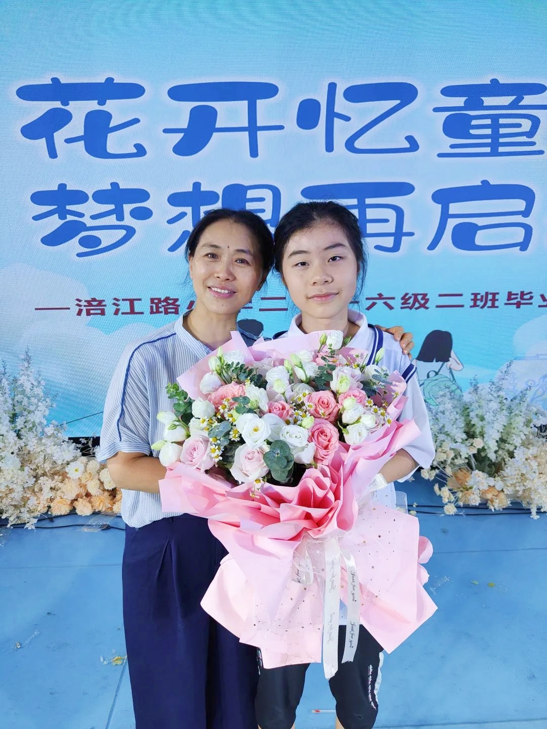 小学毕业典礼上,伍芸萱与数学老师胥秋凤合影。南充市涪江路小学供图
