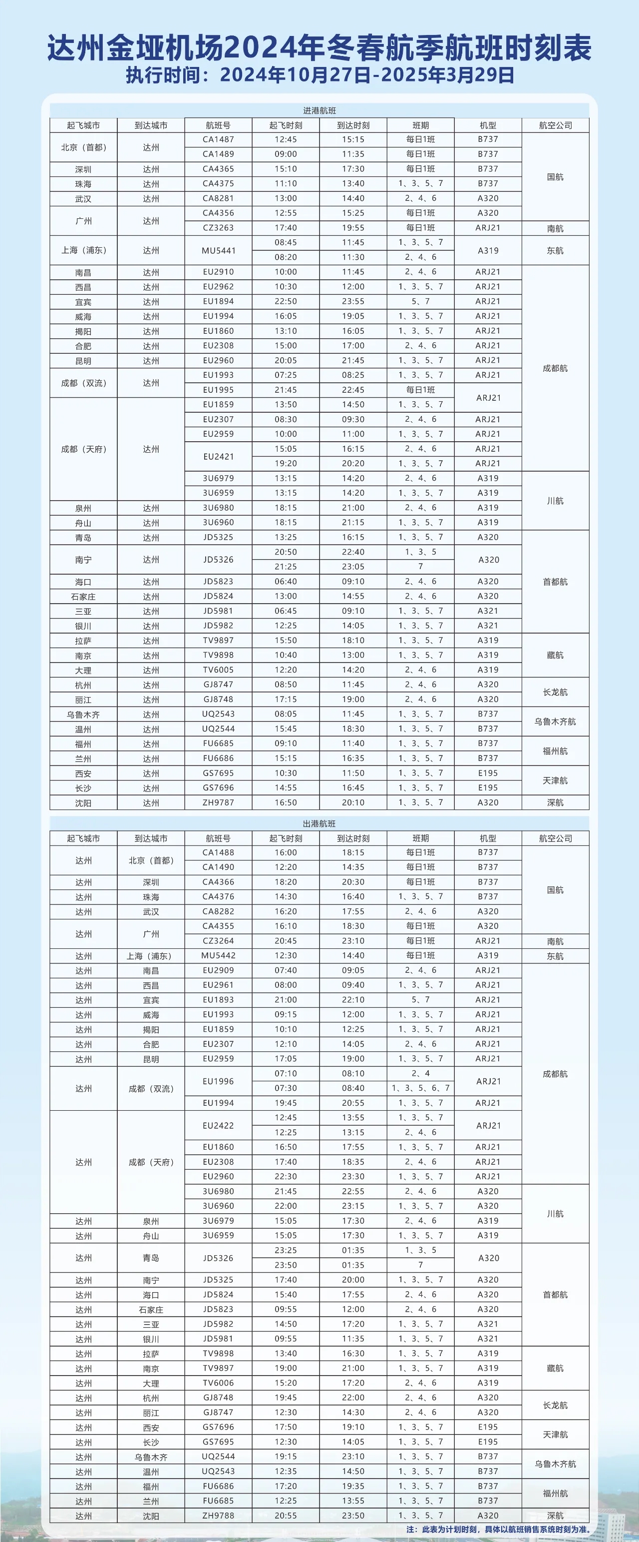 该航线由西藏航空A319飞机执行,周二、四、六执飞,飞行时刻为12时20分从大理起飞,14时20分抵达达州;返程航班为15时20分从达州起飞,17时20分抵达大理。