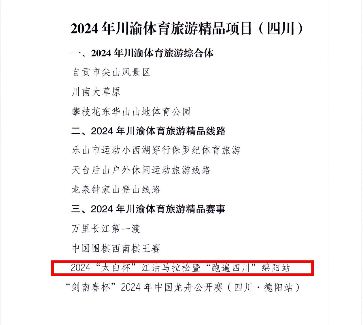 11月5日至6日,在重庆市巴南区举行的2024年成渝体育联盟暨第八届重庆市旅游产业发展大会上,2024“太白杯”江油马拉松暨“跑遍四川”绵阳站荣获“2024年川渝体育旅游精品赛事”。