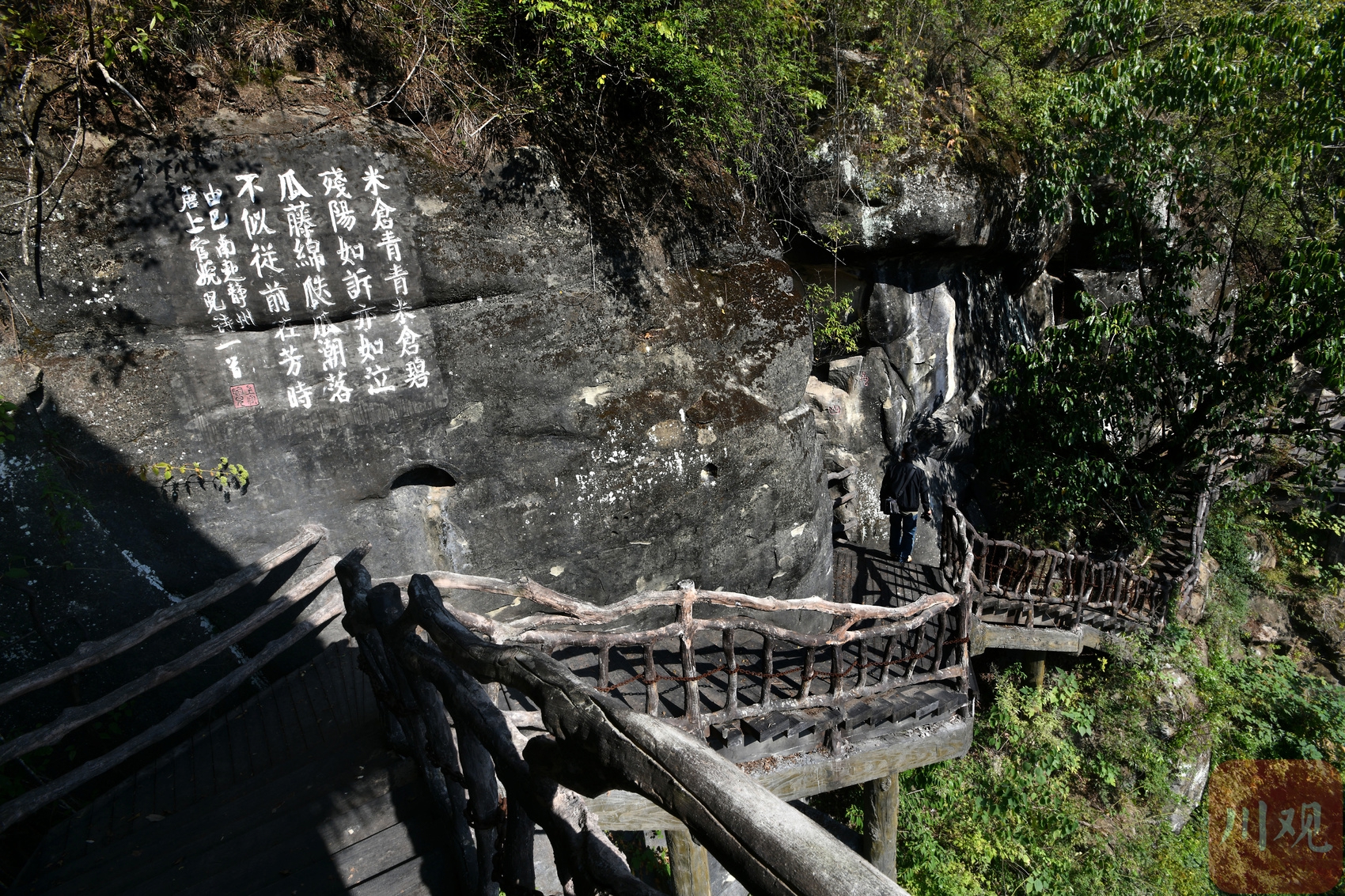 栈道石壁上刻的“蜀道难”诗词与山下的景观公路同框。