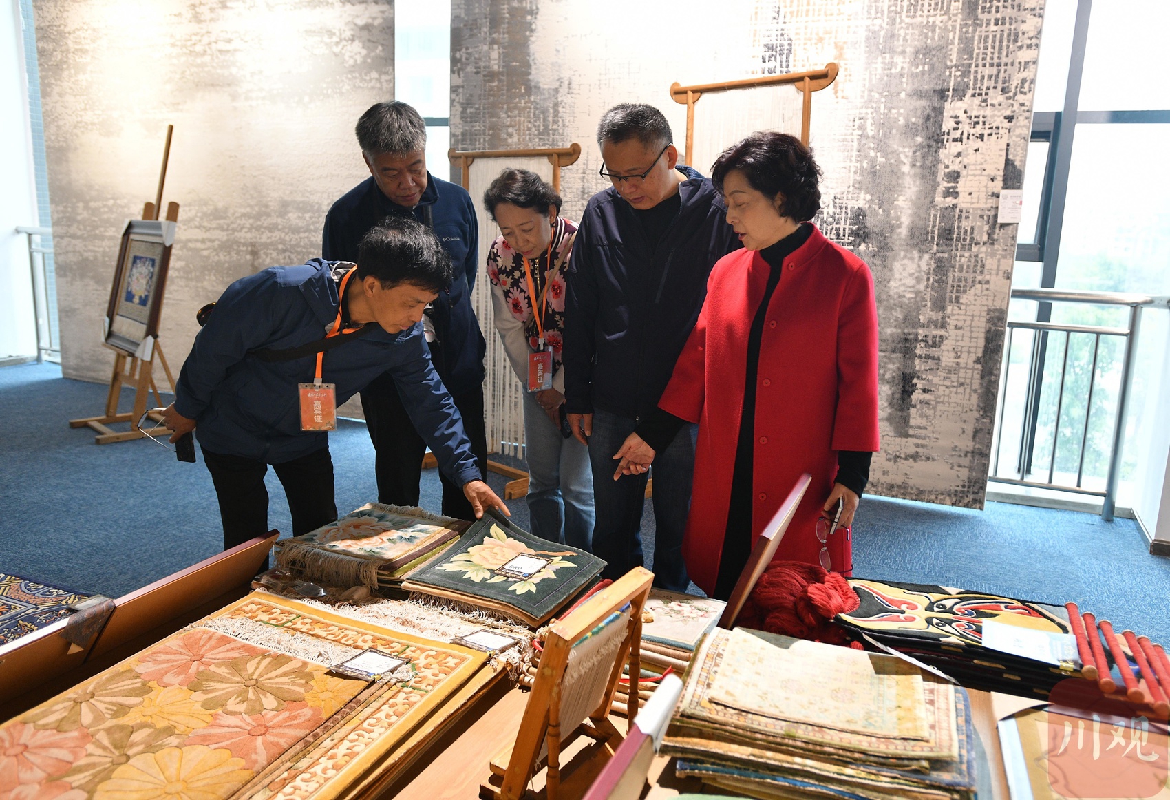 摄影名家们参观琳琅满目的阆中丝毯展厅。