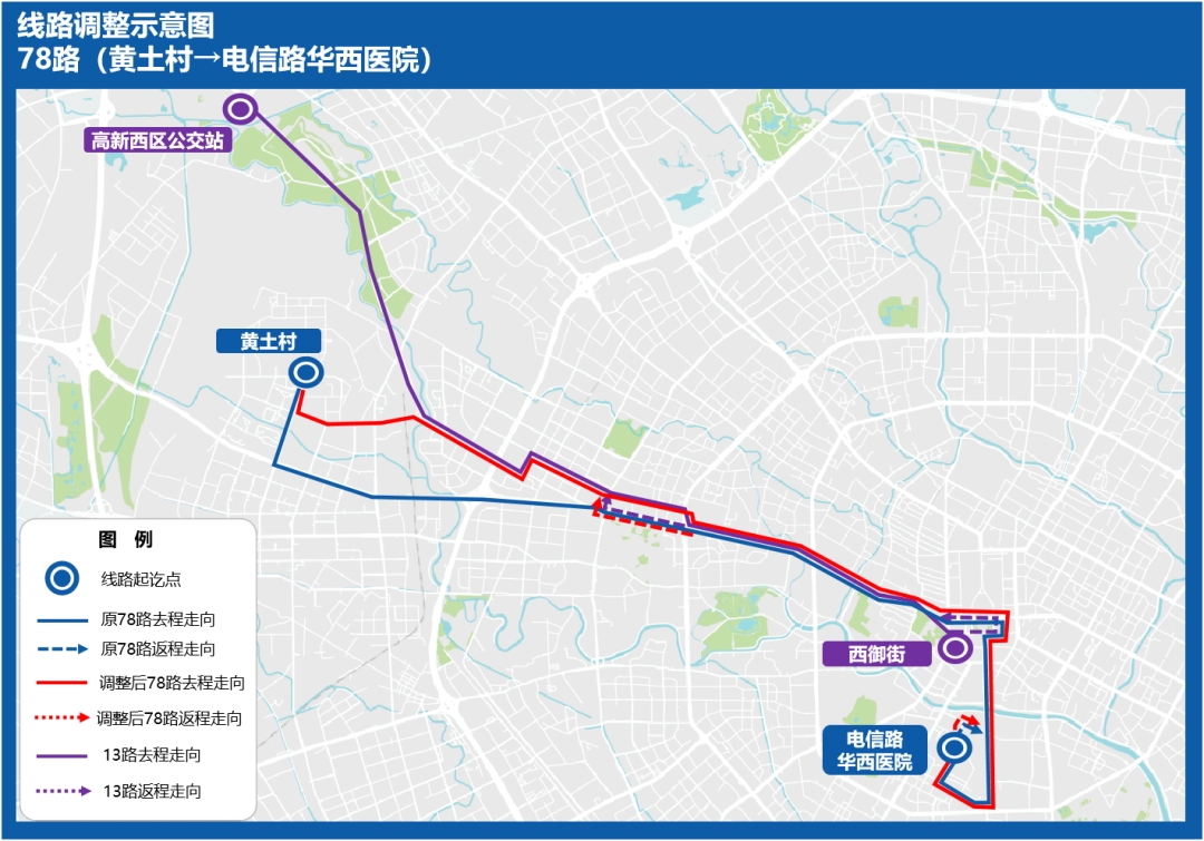 为进一步方便清江东路沿途市民通勤、就医等生活出行,拟整合13路、78路,整合后线路代码为78路,线路起讫点调整为黄土村—电信路华西医院,同步将高峰发车频率缩短至8分钟。整合后原西源大道至金辉路段公交服务将由403路、736路覆盖,原日月大道快速路至成温高架路段公交服务将由32路覆盖,满足沿途市民出行需求。