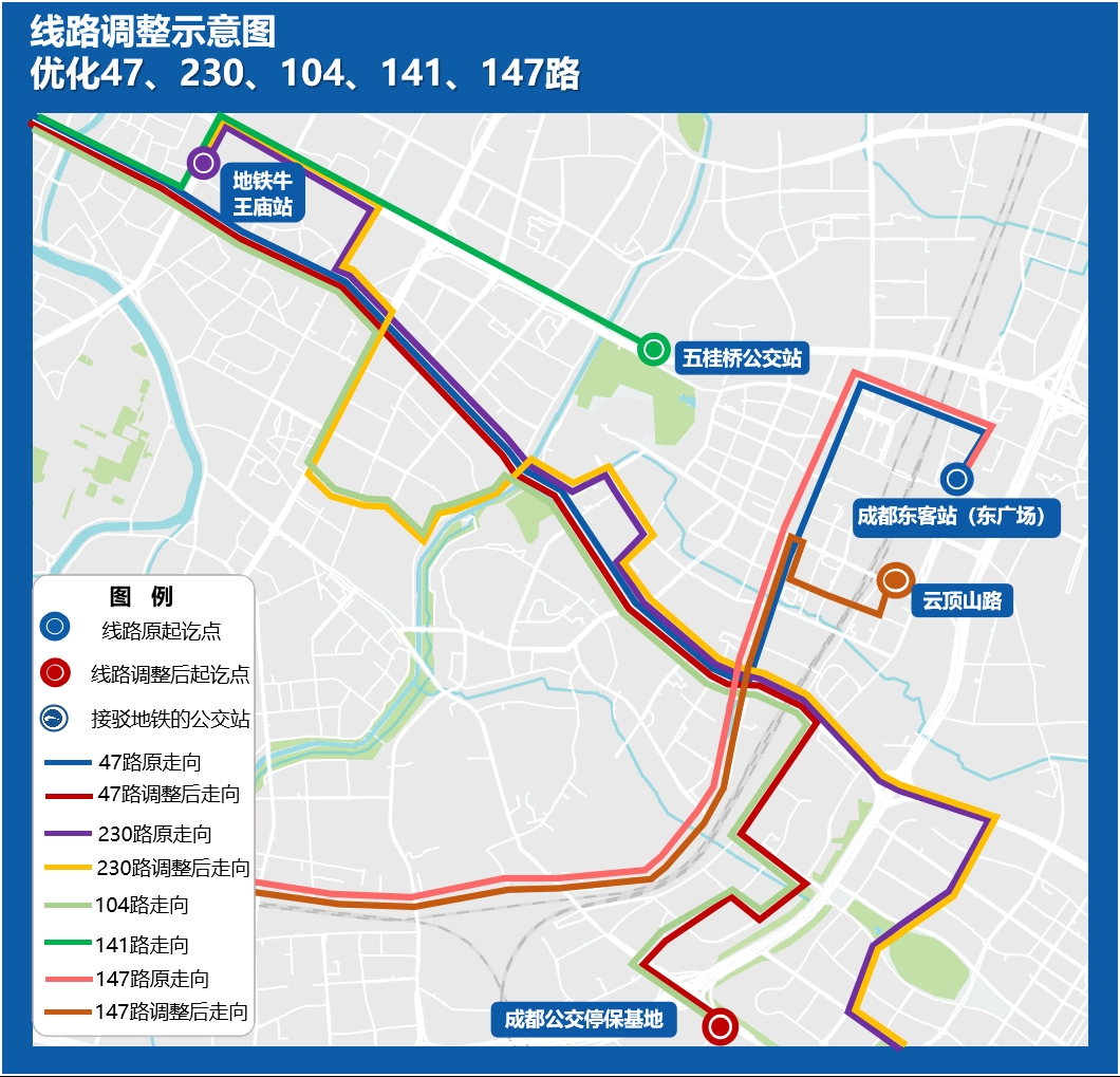 为进一步提升东大街、静明路公交服务质效,提速成都东站片区居民出行,拟整合47路、104路、141路,整合后线路代码为47路,线路起讫点调整为万家湾—成都公交停保基地;拟将147路线路起讫点调整为云顶山路—二环紫荆北路口,同步优化调整230路线路走向,原牛沙路、二环路段、中环路锦绣大道段、邛崃山路公交服务将由90路、230路、40路、71路覆盖,满足沿途市民出行需求。