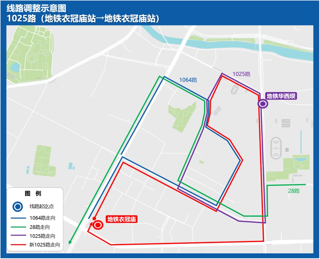 为方便华西医院片区市民换乘地铁1号线、3号线,强化公交地铁接驳服务,拟整合1025路、1064路,整合后线路代码为1025路,线路起讫点调整为地铁衣冠庙站—地铁衣冠庙站,原电信路、浆洗街公交服务将由28路覆盖,同步将高峰发车频率缩短至6-8分钟。
