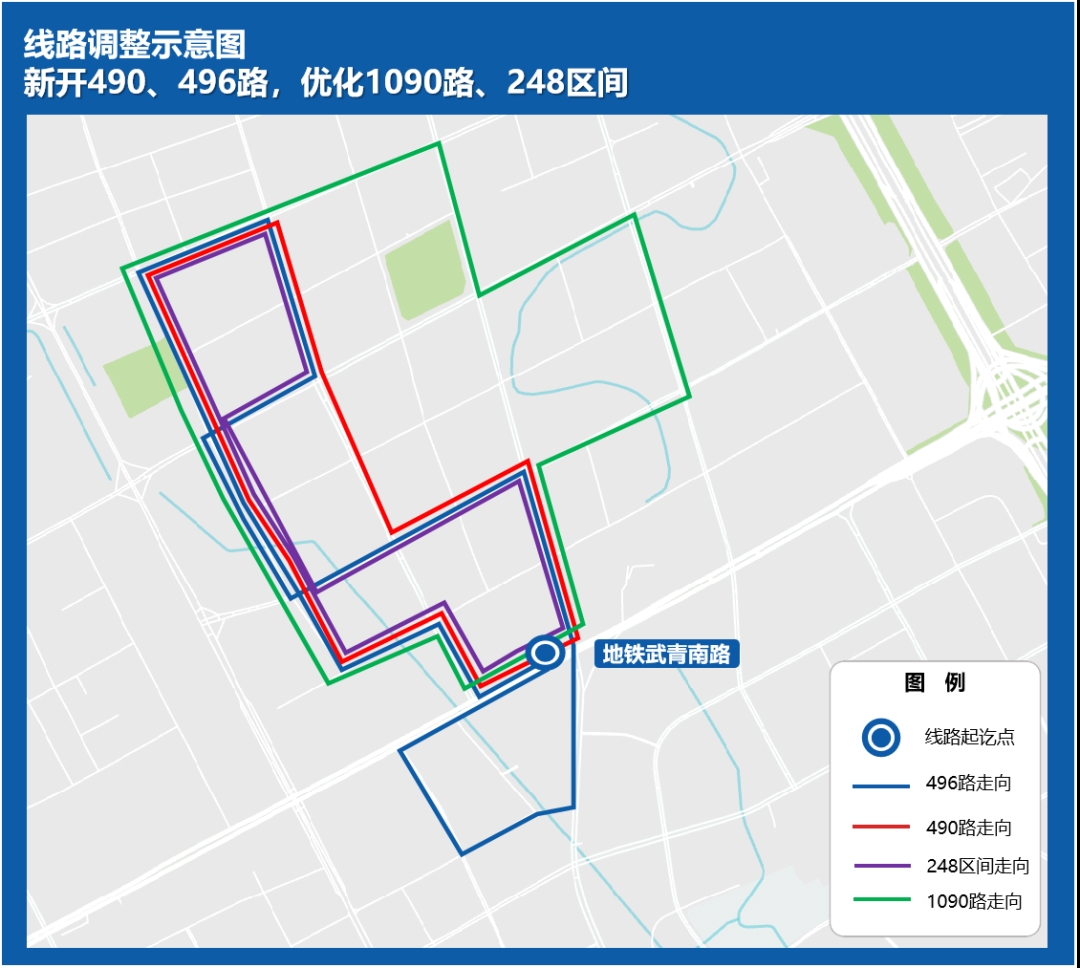 为服务西部智谷工业园企业通勤,拟新开490路、496路,线路起讫点为地铁武青南路—地铁武青南路,同步优化1090路、248区间,强化地铁3号线、9号线接驳,满足沿途市民的出行需求。