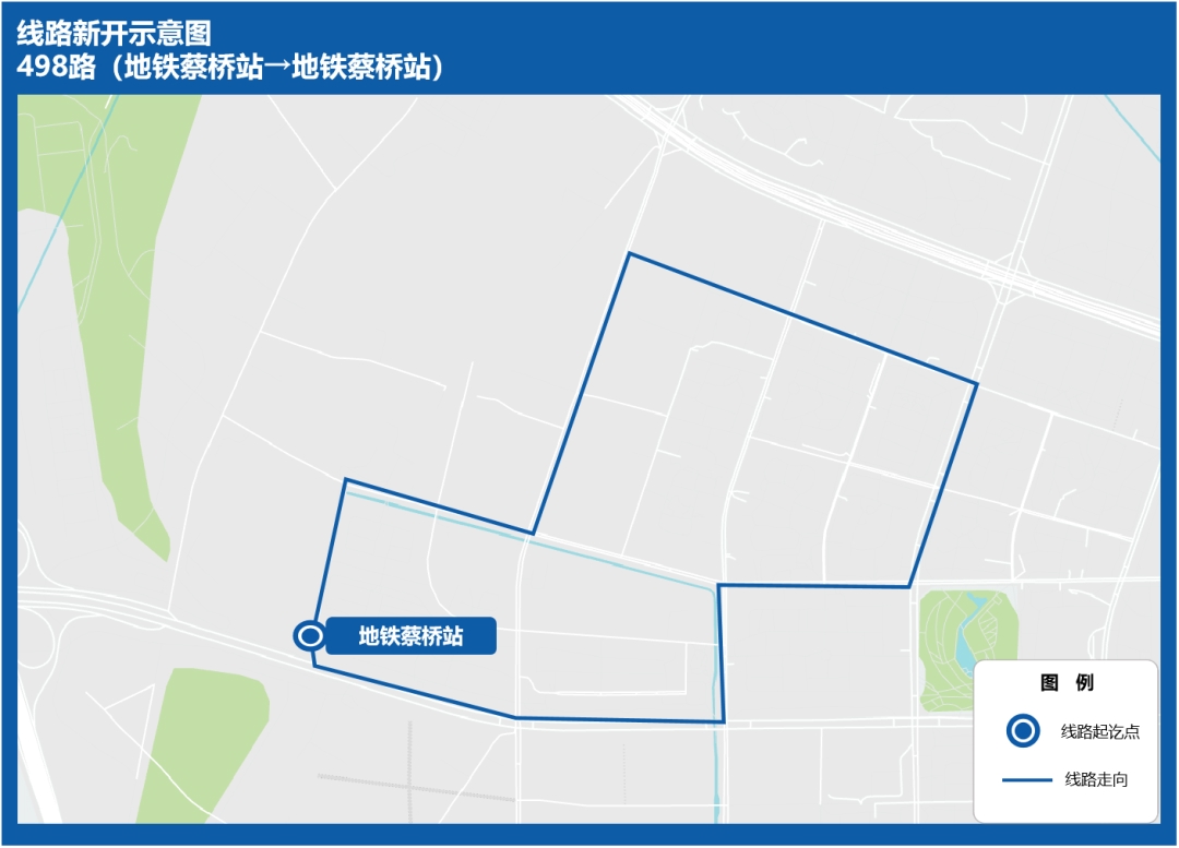 为强化光华西一路、光华北八路公交线网覆盖,方便新建小区市民前往中坝工业园区通勤,拟新开498路,线路起讫点为地铁蔡桥站—地铁蔡桥站,高峰发车频率为8分/班。