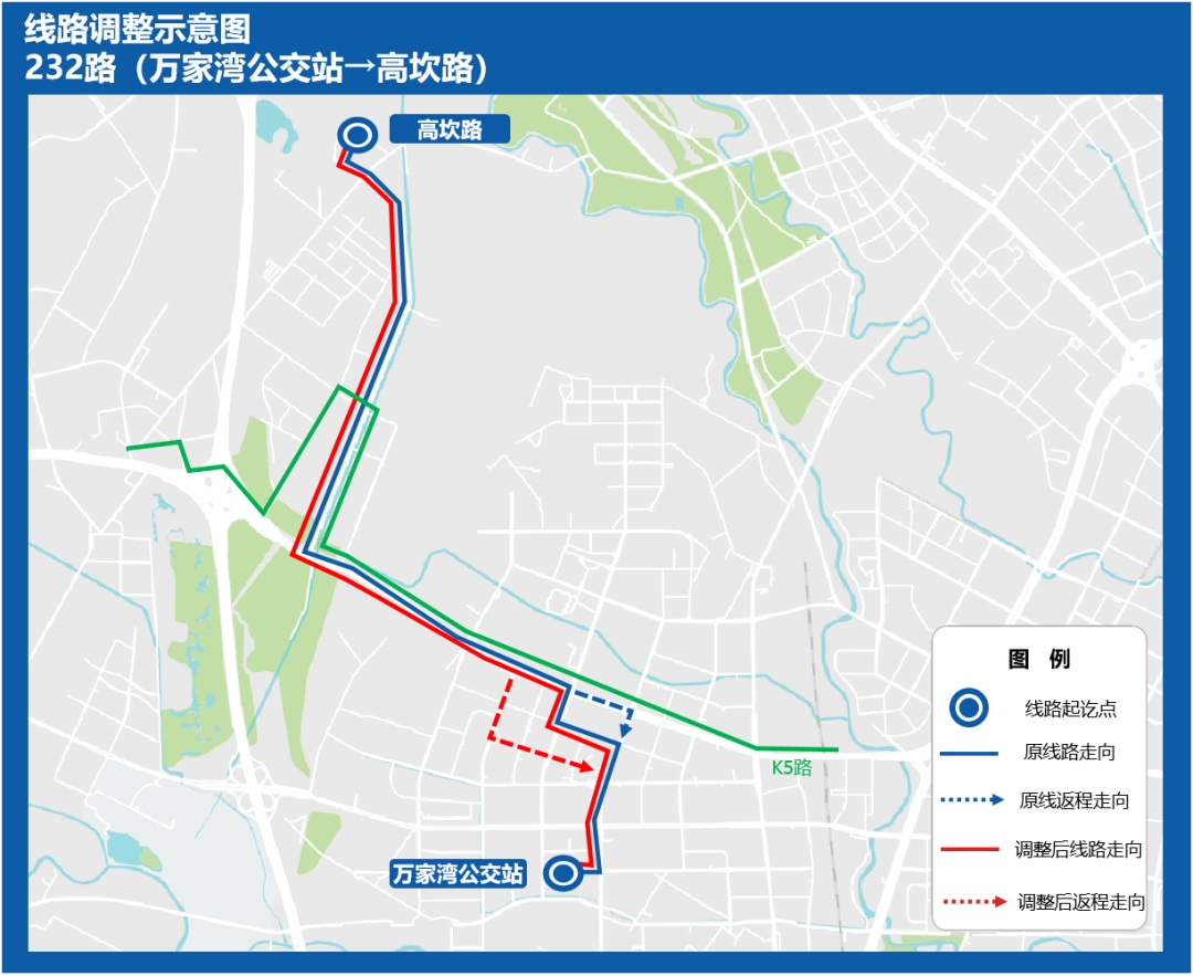 为方便光华北六路、光华西二路周边市民出行,拟调整232路线路走向,原日月大道快速上公交服务将由K5线、K5线区间、K5A线覆盖,满足沿途市民的出行需求。