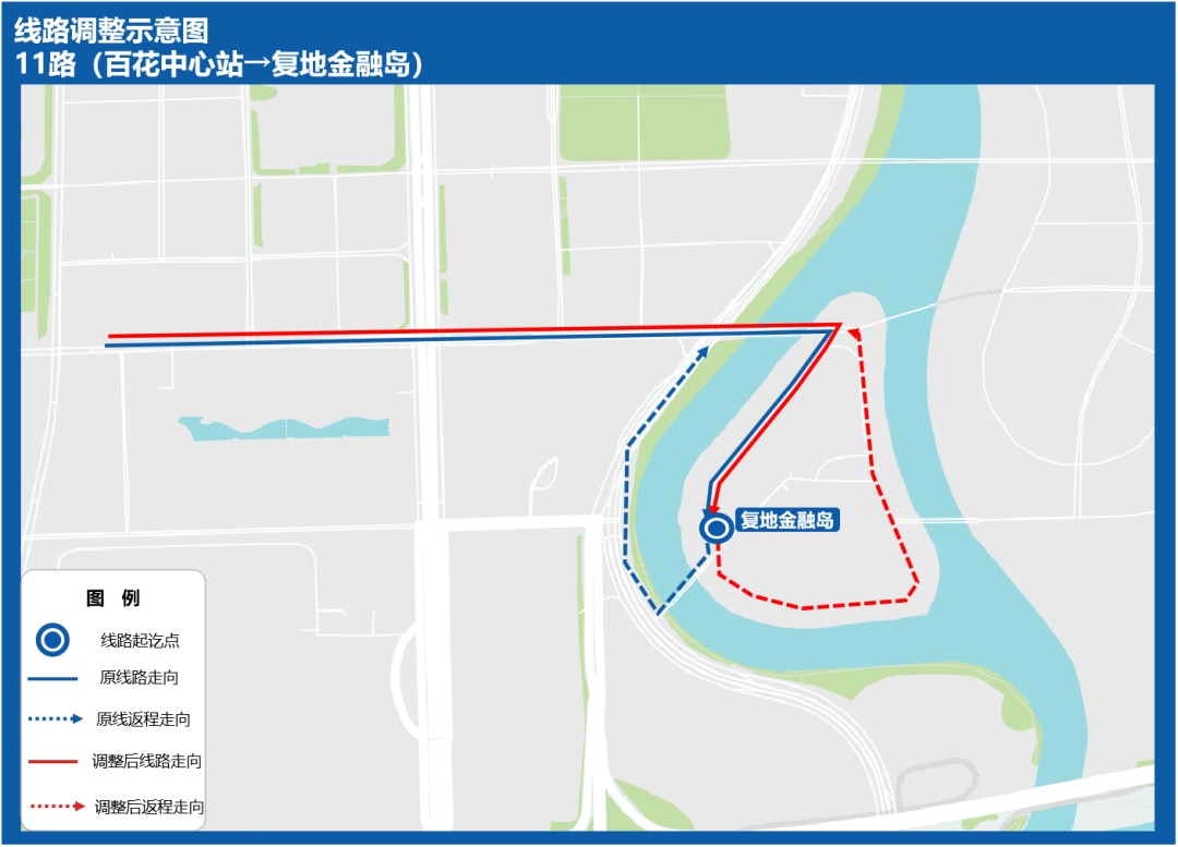 为方便复地金融岛周边市民出行,拟调整11路线路走向,提升复地金融岛公交覆盖,满足沿途市民出行需求。