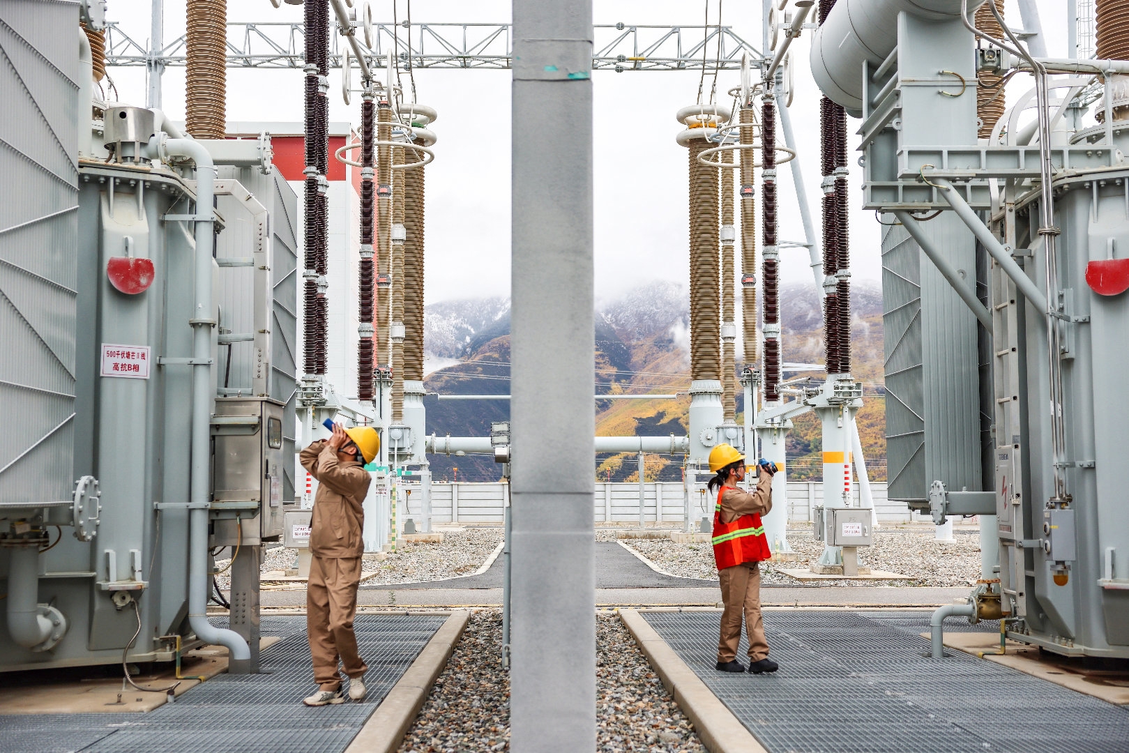 运维人员对500千伏塘芒二线间隔设备开展巡视维护工作。李威 摄