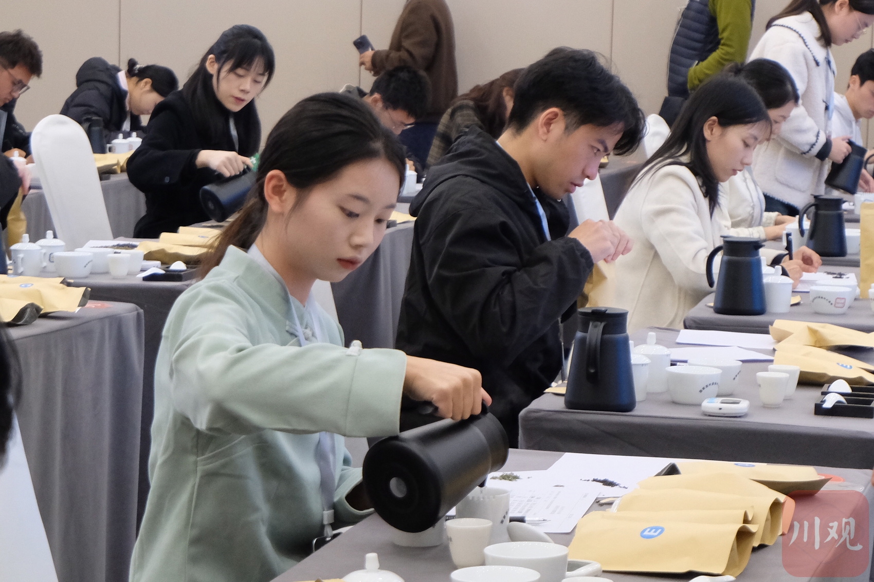 冲泡茶叶用什么水合适?什么种类的茶发展程度最高?比赛现场,同学们先是“文斗”,执笔回答茶文化相关的知识。随后,进入茶叶辩识环节,他们手捧茶叶轻嗅、细细冲泡,品茶香,鉴种类,赏滋味、察汤底等,现场茶香四溢,比赛设金奖、银奖、铜奖、优秀奖,最高奖金达1万元,奖品为蒙顶山茶珍品。