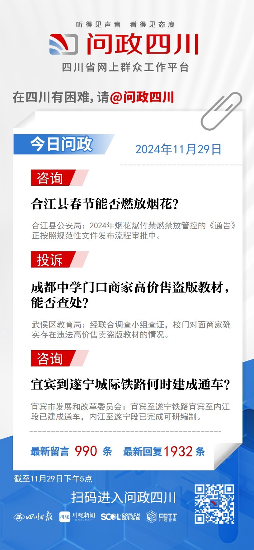 在四川有困难,找问政四川。如果您在四川遇到了操心事、烦心事、揪心事,请登录“四川省网上群众工作平台—问政四川”或拨打问政四川热线(028-96001)留言反映、求助或建议。我们将充分发挥平台的互动联系作用及舆论监督功能,第一时间传递民声,推动问题得以及时解决——听得见声音,看得见态度。