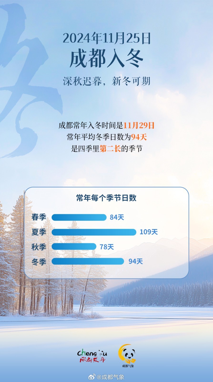 成都已于11月25日正式进入气象学意义上的冬天,较常年偏早4天。