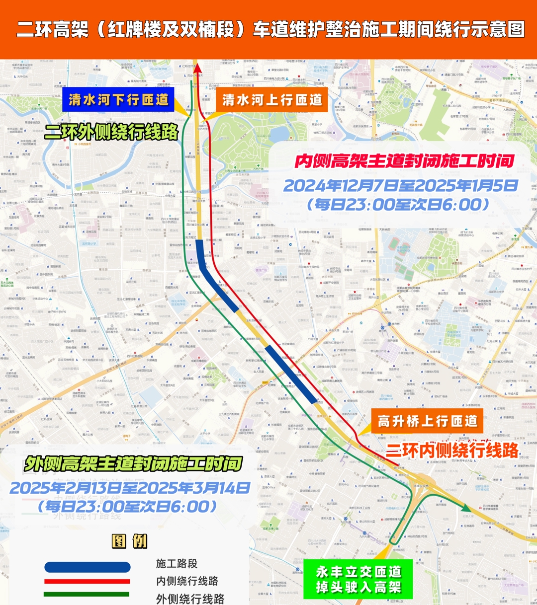 2024年12月7日至2025年1月5日(每日23:00至次日6:00),二环高架路红牌楼、双楠2座跨线桥内侧高架主道封闭施工,禁止机动车通行。详见下图: