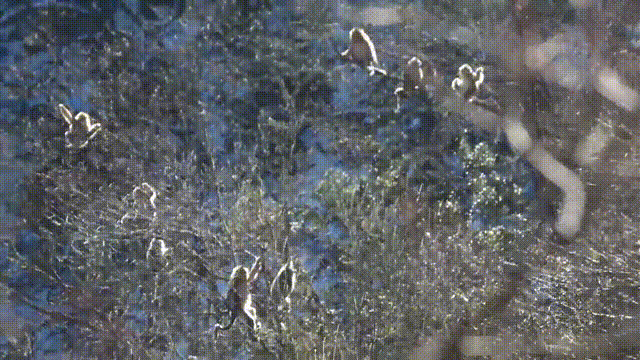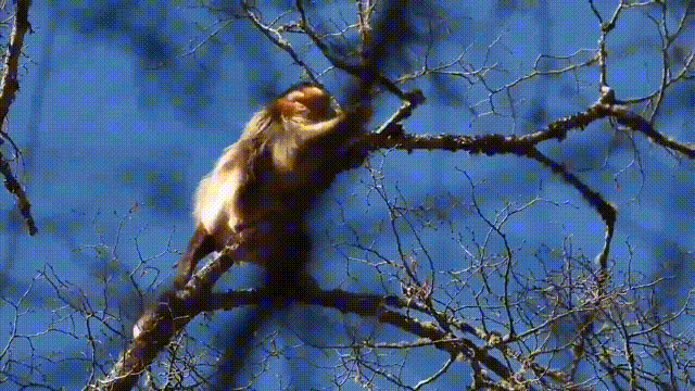 雪霁初晴,在阳光下,川金丝猴金色的毛发闪闪发光。它们有的偎依在残雪树枝上,惬意地享受日光浴,有的在树梢上欢快地荡秋千,有的忙不迭地大快朵颐。